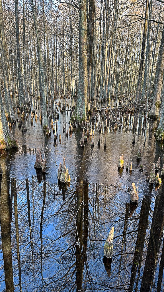 One of my favorite things to do at Mattamuskeet is spend some time on the New Holland Trail boardwalk. It passes through a cypress swamp with beautiful lichen-covered trunks, abundant cypress knees, and mind-bending reflections.