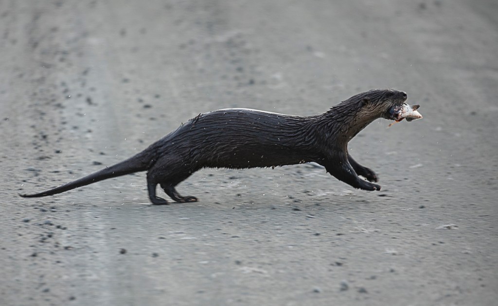A River Otter runs across the road ahead of us, lugging its breakfast