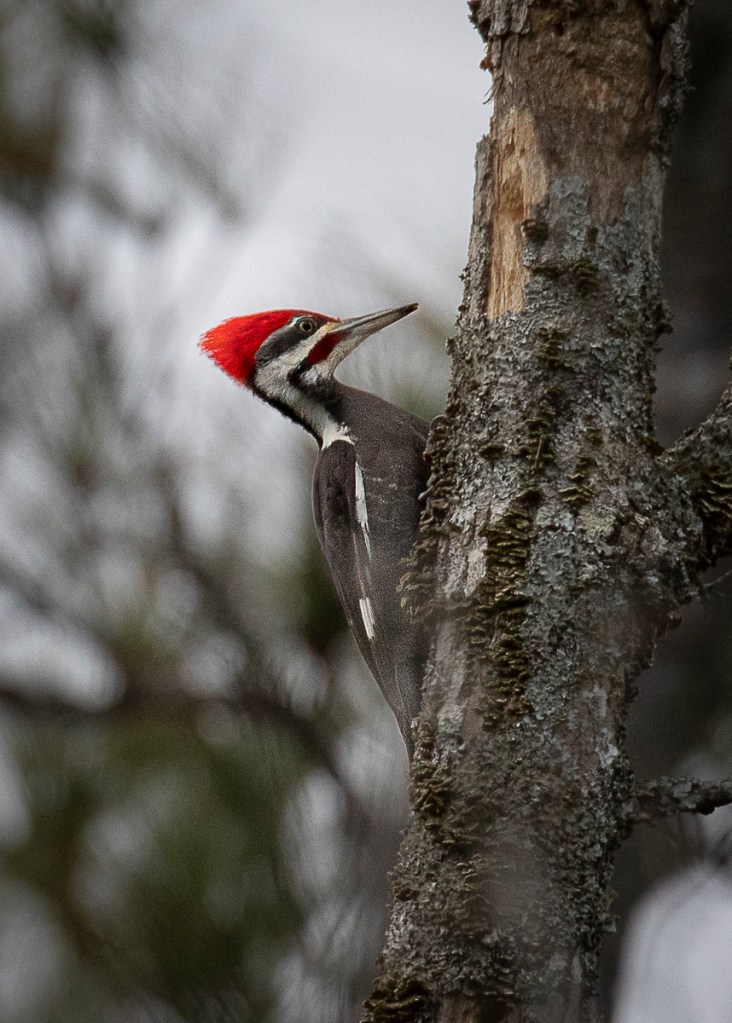 A Pileated Woodpecker playing hide and seek on a tree trunk