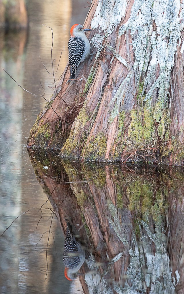 A Red-bellied Woodpecker adds her reflection to the swamp’s black water mirror