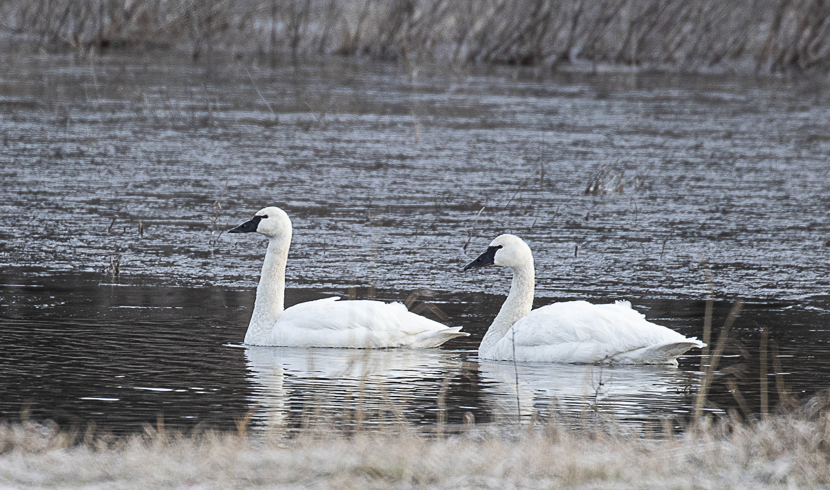 A pair of Tundra Swans cruising one of the flooded fields along the road