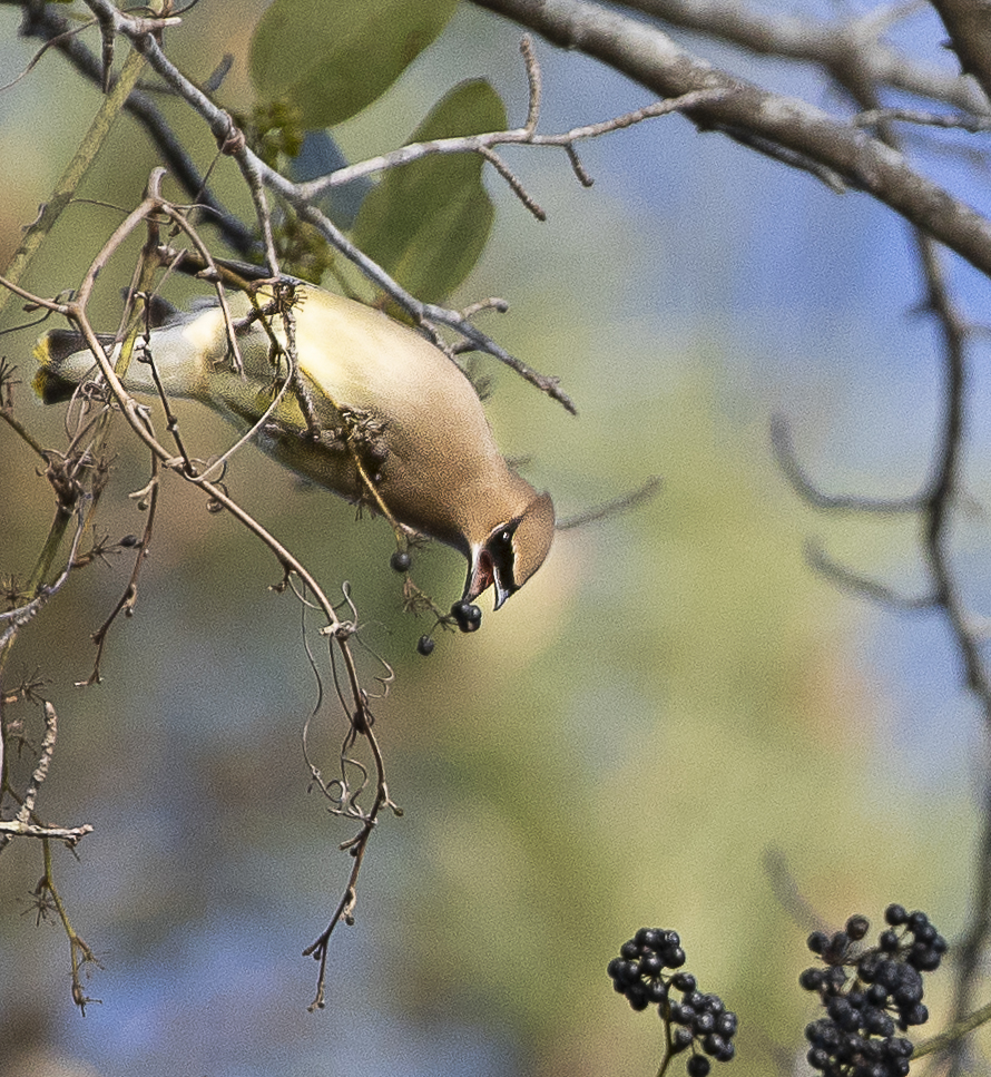 – Cedar Waxwing stretching for a Smilax berry (photo by Melissa Dowland)