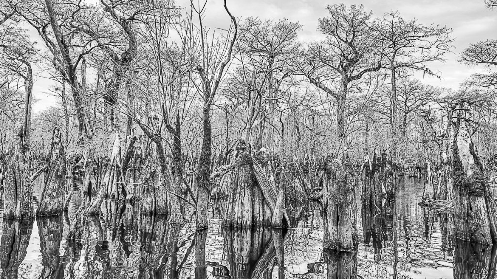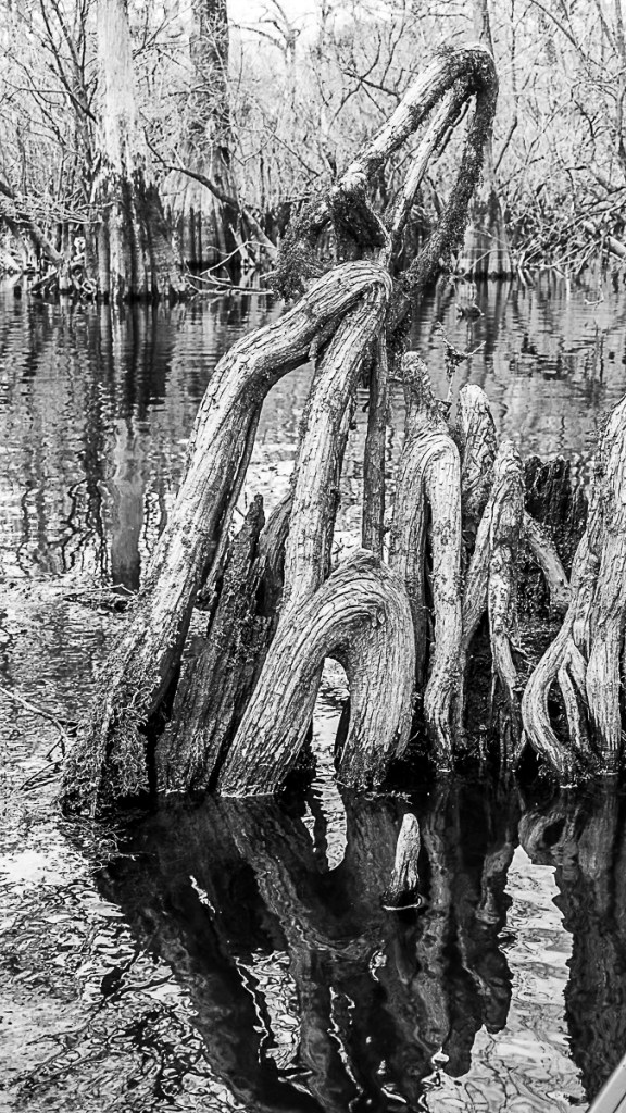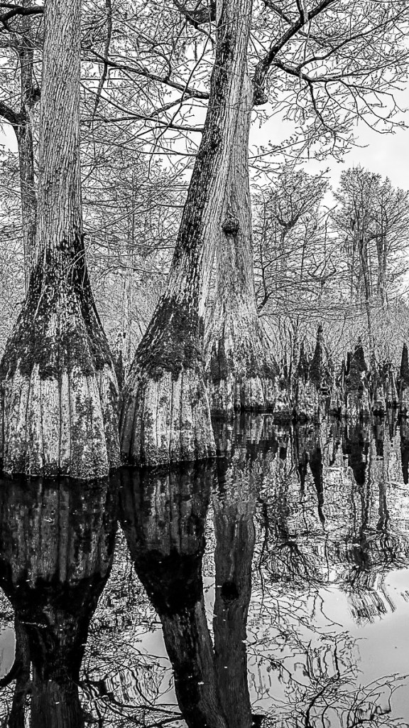 My photos on the river were all taken with an iPhone and I converted the cypress trees and scenes to black and white as I think it pays tribute to the stately nature of this forest.