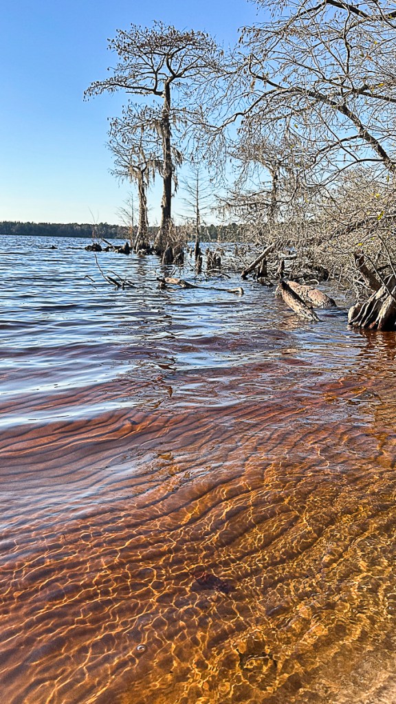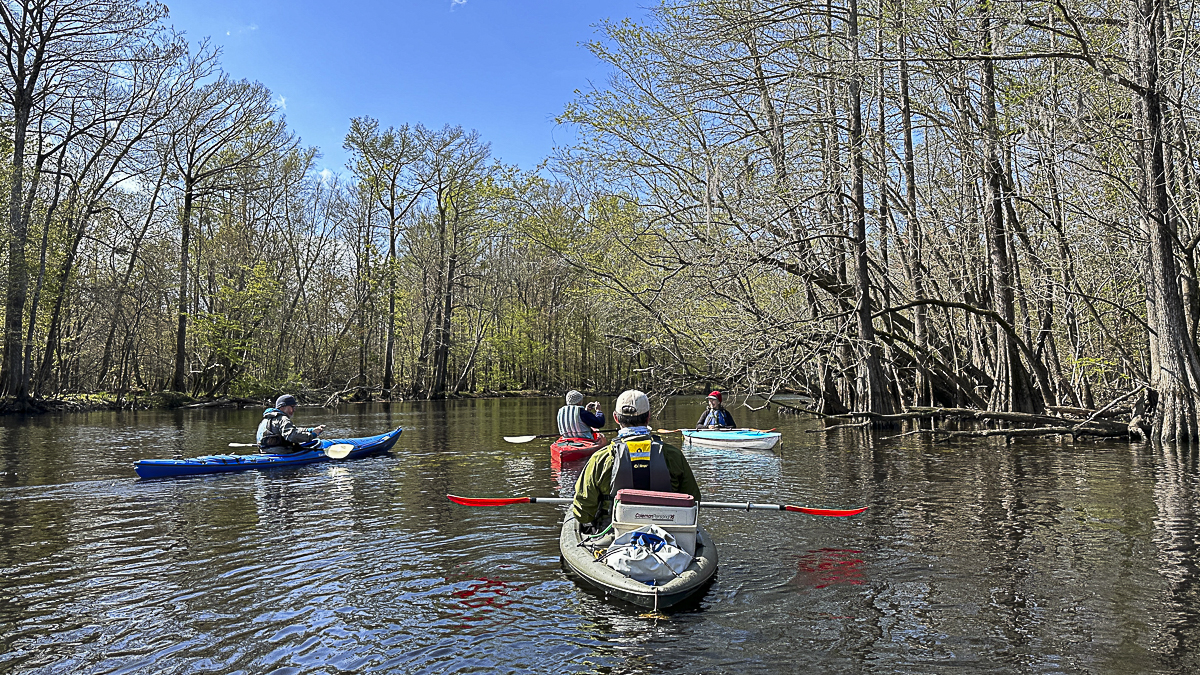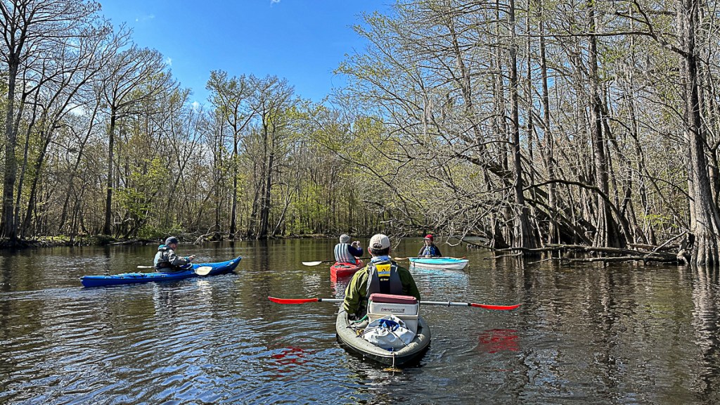 Paddling amongst these ancients is humbling…what have they seen? What storms have they survived? Jerry reminded us they they probably experienced huge flocks of Carolina Parakeets feeding on their cones before those beautiful birds went extinct. Perhaps Passenger Pigeons one darkened the skies over the trees when millions of them roamed the East before disappearing forever. And what of the stories of other humans that may have paddled these tea-colored waters in the past couple of thousand years?