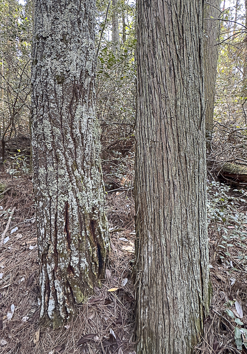 -The grooved trunk of Loblolly Bay (left) and the more finely patterned trunk of a nice Atlantic White Cedar (right) along the Bay Trail