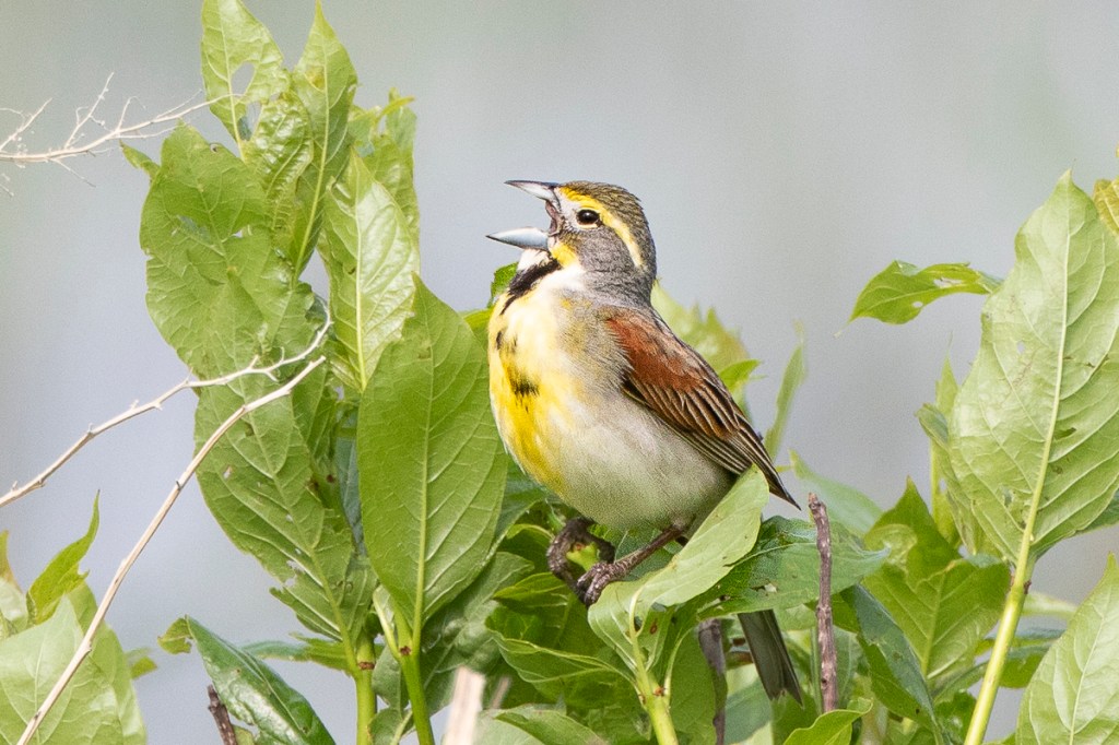 -A male Dickcissel singing. Males do not assist with the care of young but rather spend the breeding season vigorously defending their territories. Dickcissels are somewhat solitary on the breeding grounds but gather in huge flocks (sometimes numbering in the millions) on their wintering grounds in Venezuela.
