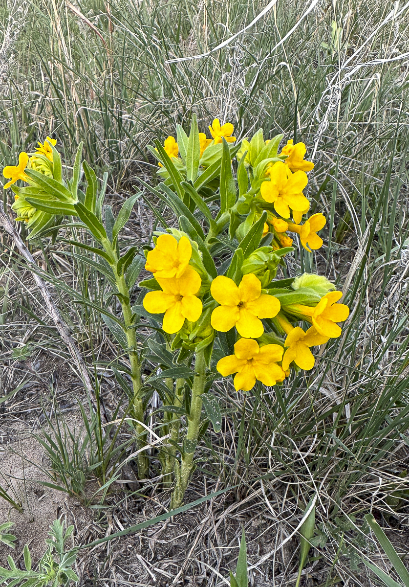 -One of the prairie wildflowers known as puccoon (Lithospermum sp.). The common name comes from the Powhatan word, poughkone, which refers to the dye produced from the roots. The genus names translates to “rock seed” and refers to the very hard seeds of this plant.