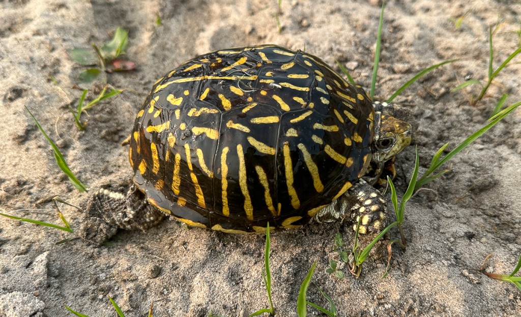 -This beautiful Ornate Box Turtle had somehow climbed into the stock tank (from the overhanging shrub?), but had no chance of getting out and was floating in the water. I gently placed it on the ground and it scurried away through the grass. Populations are declining in its range due to habitat loss and fragmentation. We helped another as it was crossing a road the next day.