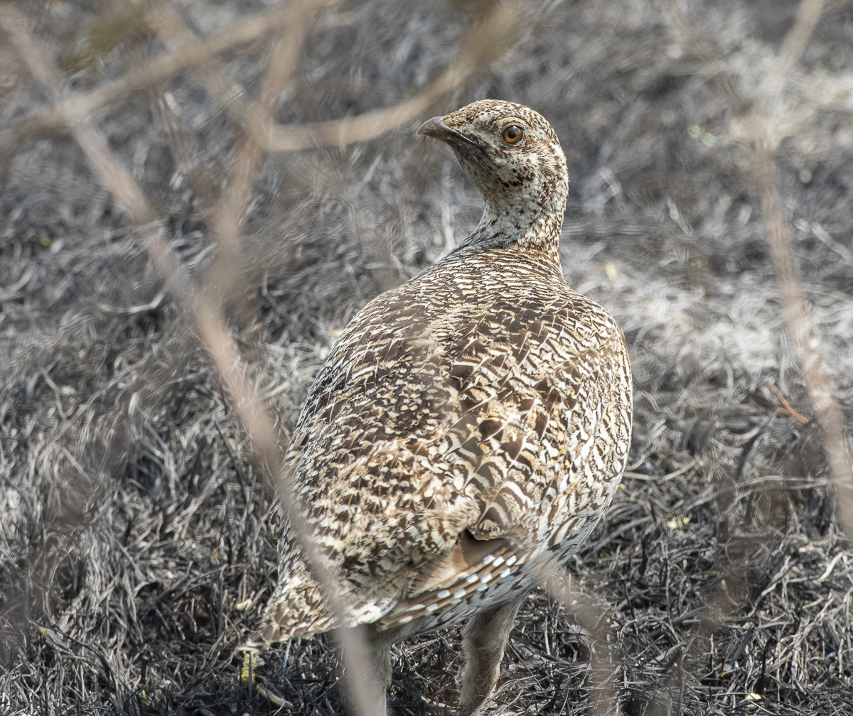 -A Sharp-tailed Grouse trying to hide in habitat recently burned