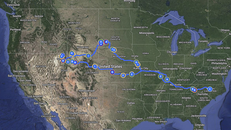 -Our route from May 9 – May 26, 2023 (the lower leg was on the way out) – 5656 miles