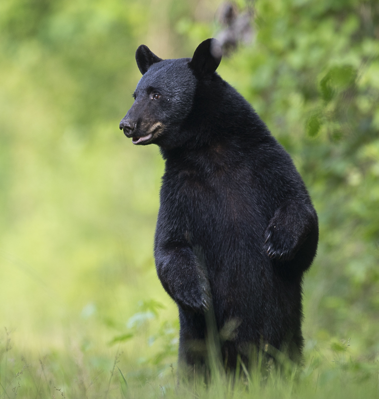 I saw it well before it noticed me. I knelt down and watched as the bear sampled some vegetation and moved slowly back and forth along the opening. Suddenly, it stopped and stood up. It was turning its head slightly from side to side so I am guessing it had caught my scent (which might have been significant in that heat and humidity!).