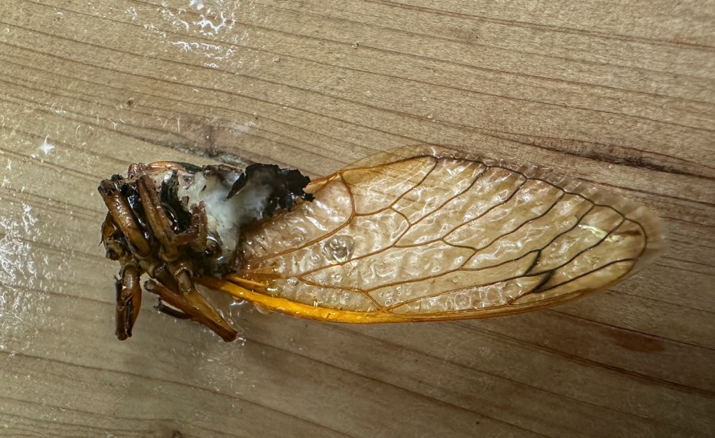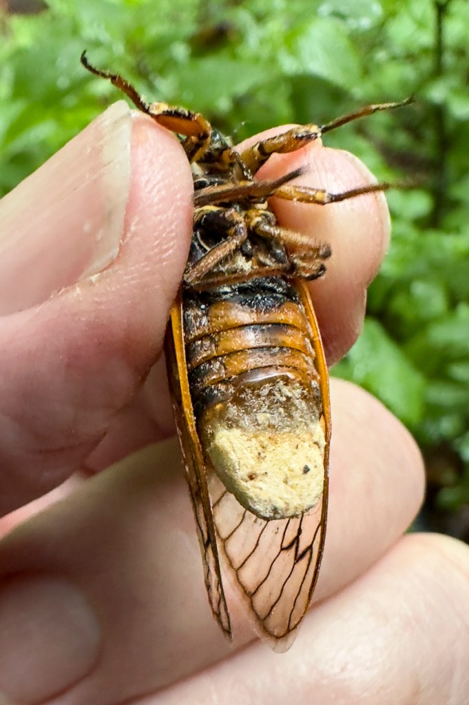 A stage 1 infection of this fungus on a cicada shows up as a whitish coating on the lower third of its abdomen. This fungus has a bizarre life history, matching that of its “prey”, the periodical cicadas (the fungus is known to infect both 13-year and 17-year periodical cicadas). I found a transcript online of an interview with Dr. Matt Kasson, an associate professor of forest pathology and mycology at West Virginia University. He has been studying this unique fungus for a number of years and described some of its unusual characteristics. Unlike other types of so-called zombie fungi (they alter the behavior of their host to create conditions better for spore dispersal) in which the death of the host is the usual means of better spore dispersal, this fungus exhibits active-host transmission. It keeps the host alive in order to better spread the spores. It does this by altering the cicadas behavior. He called the behavior hypersexualization. Male cicadas with the fungus will try to mate with females but will also exhibit the female behavior of wing flicking which creates an audible snapping sound. Uninfected males do not wing flick. Females do this in response to the male calls. This causes other male cicadas to try to mate with the infected males, enhancing the chances for fungal dispersal. One paper suggested this is a type of STD for cicadas!
