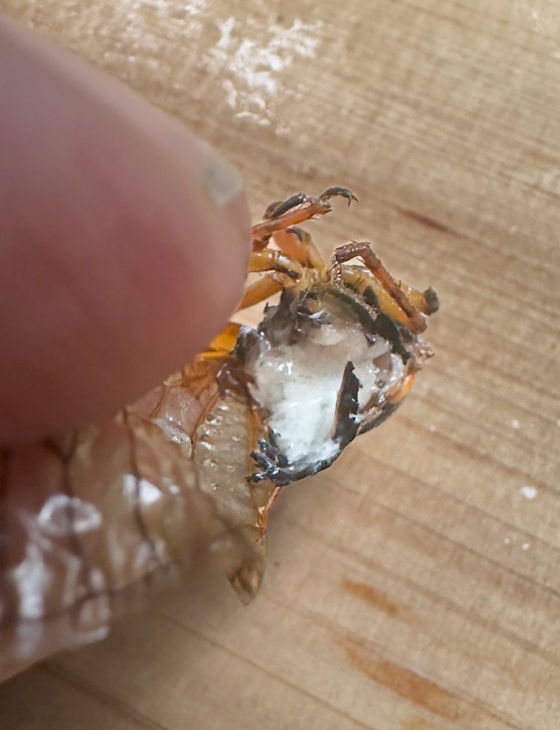 Yesterday’s blog on Brood XIX was a brief summary of what I have been doing the past several evenings as I marvel at this occurrence. There are two things I had hoped to find in this year’s emergence after reading more about these amazing insects – a blue-eyed adult (a rare genetic oddity) and one with a fungus-infected rear end. I still haven’t seen a baby blue-eyed bug, but I have found one with a white butt. Oddly, I carried something from the front porch inside and when I walked back into the foyer, there was a cicada crawling on the floor (a hitch hiker on that package I carried in I suppose). I picked it up and was going to release it outside when I saw its rear was white. The fungus!