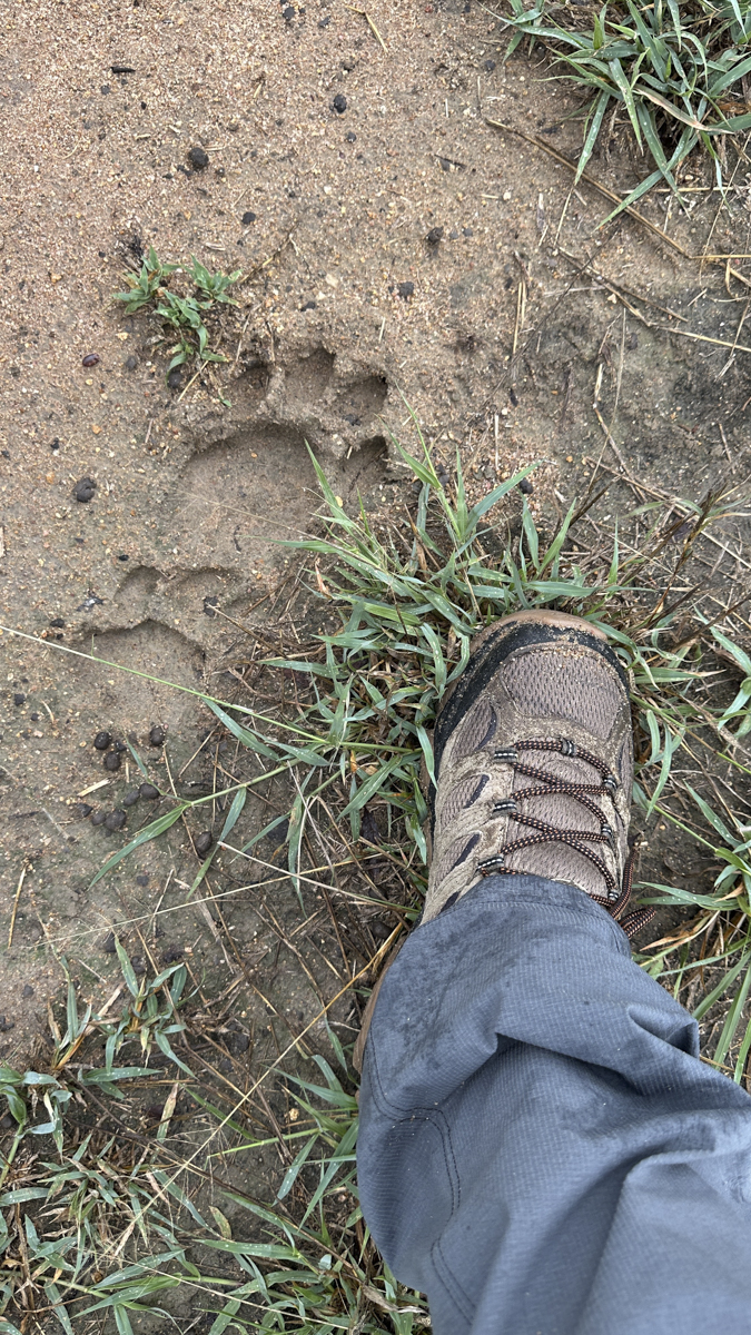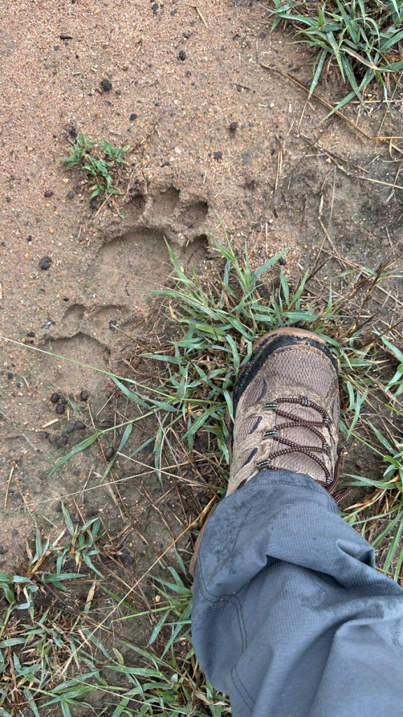 When we finally reached our destination, we had two Kruger rangers with rifles as our leaders. Oddly, they both walked at the front of the single file line of us hikers. I was next to last and turned to the person behind me and said, “good luck”. We walked at a brisk pace but made frequent stops to hear about the plants and animals along the trail. Early into the hike, we encountered hyena tracks, and then lion tracks.
