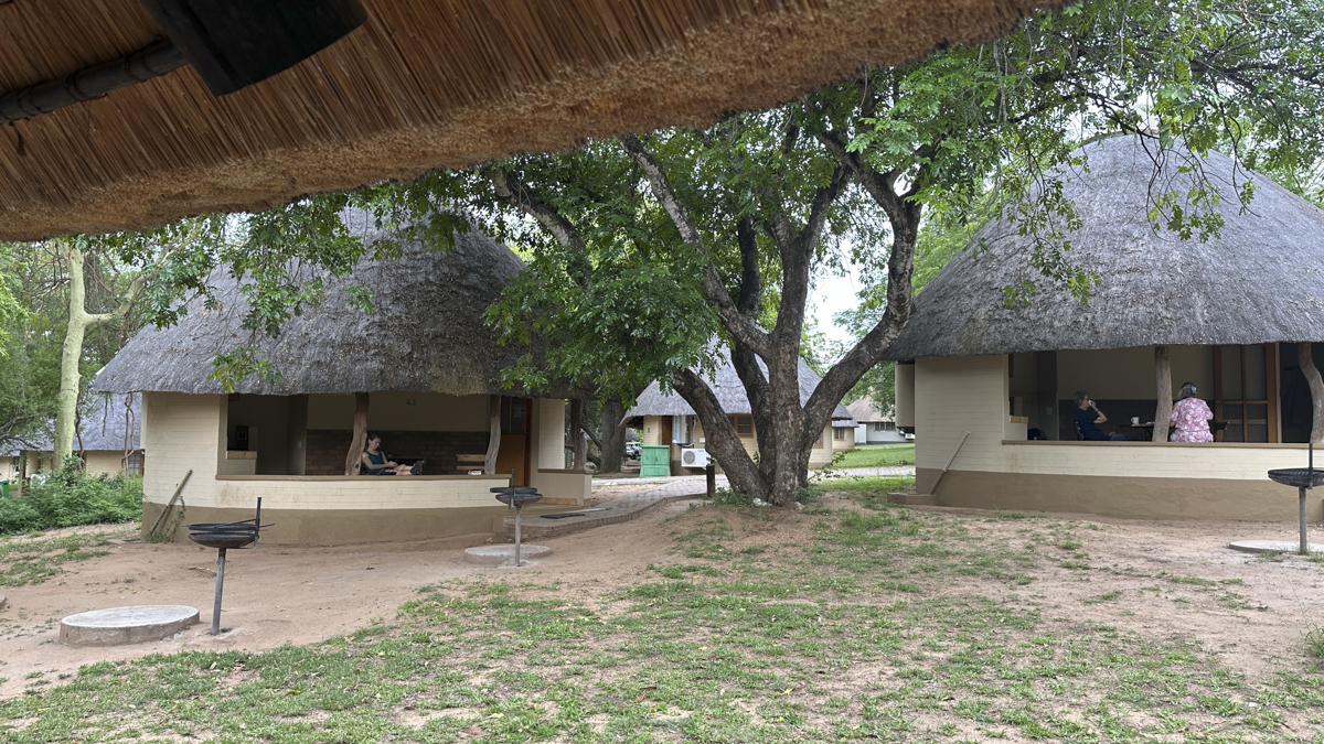 Now, back to our trip. After two nights at Berg-en-Dal, we drove over an hour to our next lodging – Skakuza Rest Camp situated along the Sabie River. Our accommodations were in thatched-roof round huts called rondavels. We had an ambitious schedule with a night game drive our first night, followed by an early start for a guided bush walk the next morning. I had read about the possibility of seeing fruit bats roosting under the eaves of some of the buildings at this camp, so when we arrived, a few of us started looking and soon discovered a large bat hanging upside down on the edge of the roof of the restaurant.