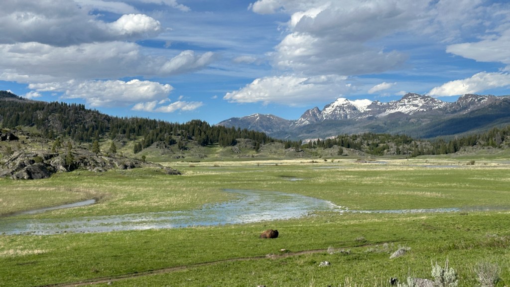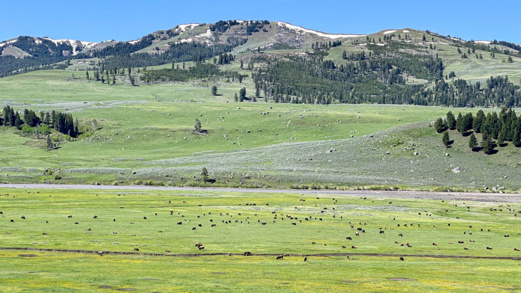 As always in Lamar Valley, the Bison are the real stars of the megafauna, especially with so many “red dogs” (young calves) frolicking or sprawled out asleep in the grass. But we also witnessed a sad and yet fascinating Bison behavior – acknowledging the death of a member of the herd.