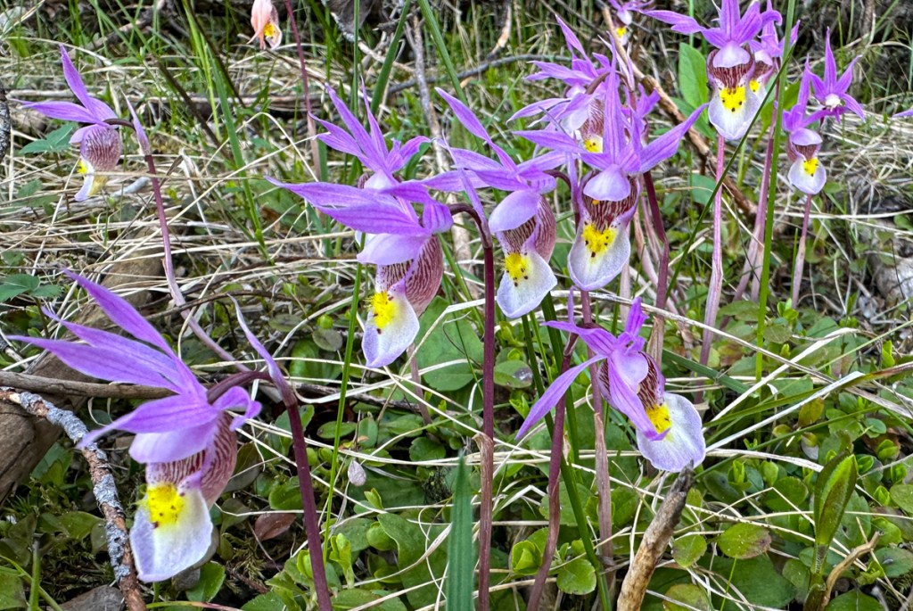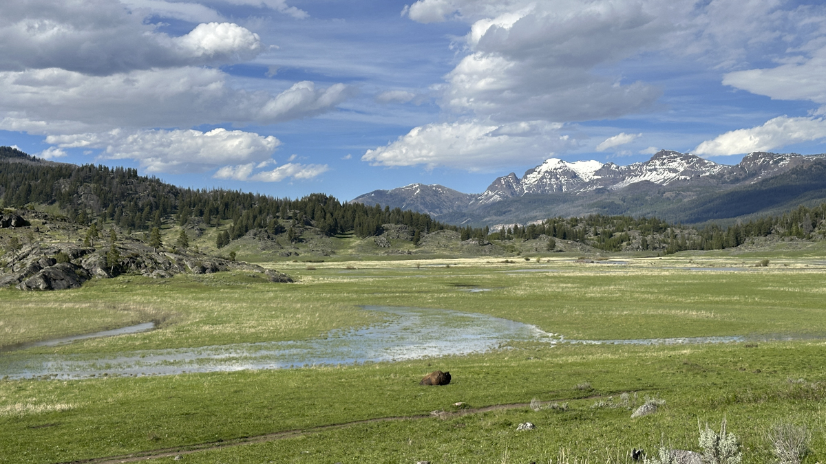 On our first night in the park, we went out for a few hours and soaked it all in and were amazed at the number of Bison in the green valley floor of Lamar Valley. The next day we met our friends (both NPS employees) and backpacked to the Lower Slough patrol cabin. Ivan is the backcountry office manager for the park and inspected all the backcountry campsites along our route. It was a fairy easy hike up the Slough Creek valley with little elevation gain (good for my bad back/legs). The weather was perfect and spring wildflowers were dotting the landscape in abundance.