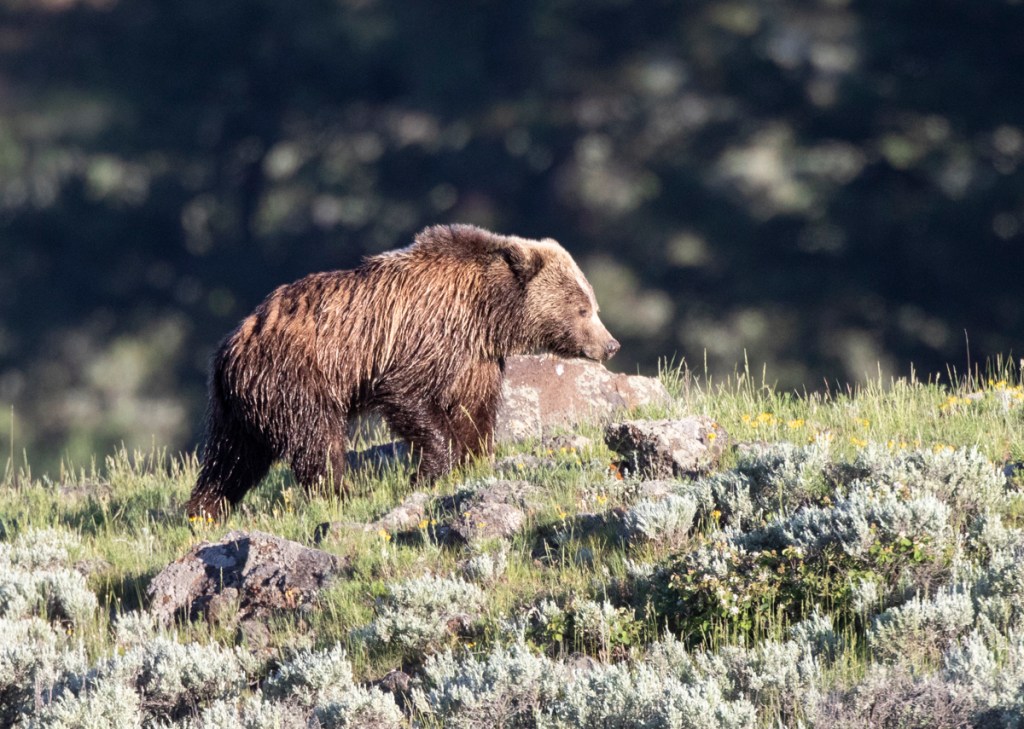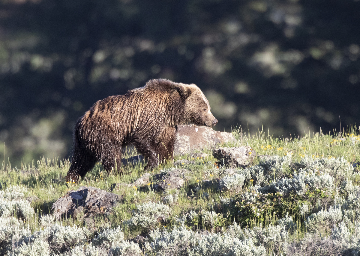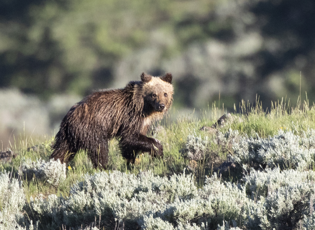 Driving into Lamar from the northeast one day, we saw a group of people at a pullout looking down toward Soda Butte Creek. They told us a Grizzly sow and cub (from the previous year) had just crossed the creek and had disappeared behind the ridge. We stopped at the next pullout and a group of people, chaperones and young students, were headed back to the parking lot saying “there are two Grizzlies headed this way”. I commend the leaders of this group for doing the right thing when they saw the bears – move everyone to safety and don’t try to get close for a photo!! In just a couple of minutes, the bears crossed the road.