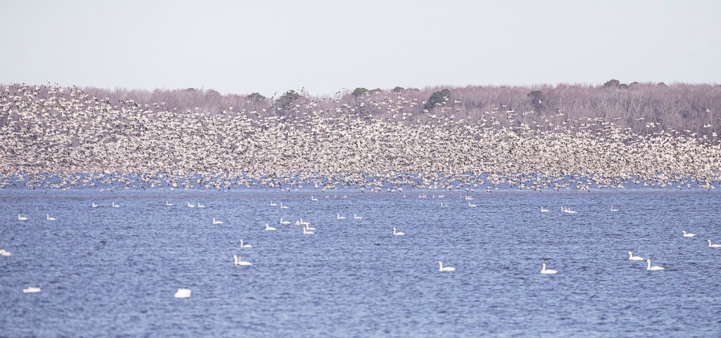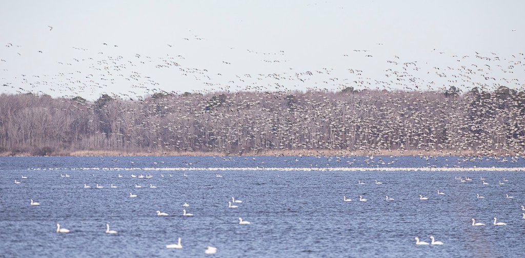 Snow Goose (8000); Ross’s Goose (9); Tundra Swan (9000); Gadwall (1000); American Wigeon (800); American Black Duck (120); Northern Pintail (630); Green-winged Teal (2000); Ring-necked Duck (300); Canada Goose (300); Wood Duck (1); Blue-winged Teal (4); Northern Shoveler (30); Mallard (90); Hooded Merganser (7); Ruddy Duck (1); Sandhill Crane (22); Great Blue Heron (8); Wilson’s Snipe (150); Killdeer (126); American Woodcock (4); Greater Yellowlegs (6); Ring-billed Gull (250); Mourning Dove (148); Black Vulture (5); Turkey Vulture (27); Sharp-shinned Hawk (2); Northern Harrier (5); Bald Eagle (14); Red-shouldered Hawk (1); Red-tailed Hawk (4); American Kestrel (4); Eastern Screech Owl (3); Great Horned Owl (2); Belted Kingfisher (4); Yellow-bellied Sapsucker (9); Red-bellied Woodpecker (13); Downy Woodpecker (14); Hairy Woodpecker (1); Pileated Woodpecker (4); Northern Flicker (18); Ash-throated Flycatcher (1); Chipping Sparrow (1); White-throated Sparrow (70); Savannah Sparrow (35); Song Sparrow (40); Swamp Sparrow (30); Eastern Towhee (6); Eastern Meadowlark (17); Red-winged Blackbird (4000); Brown-headed Cowbird (1); Rusty Blackbird (102); Common Grackle (35); Northern Cardinal (12); European Starling (3); Eastern Phoebe (25); Blue-headed Vireo (1); Blue Jay (10); American Crow (9); Carolina Chickadee (50); Tufted Titmouse (1); Horned Lark (12); Tree Swallow (100); Ruby-crowned Kinglet (13); Golden-crowned Kinglet (5); Brown-headed Nuthatch (4); Blue-gray Gnatcatcher (1); Northern House Wren (1); Carolina Wren (15); Gray Catbird (9); Brown Thrasher (1); Northern Mockingbird (4); Eastern Bluebird (5); Hermit Thrush (7); American Robin (200); Cedar Waxwing (20); House Finch (2); Purple Finch (2); American Goldfinch (12); Orange-crowned Warbler (1); Palm Warbler (25); Yellow-rumped Warbler (60)