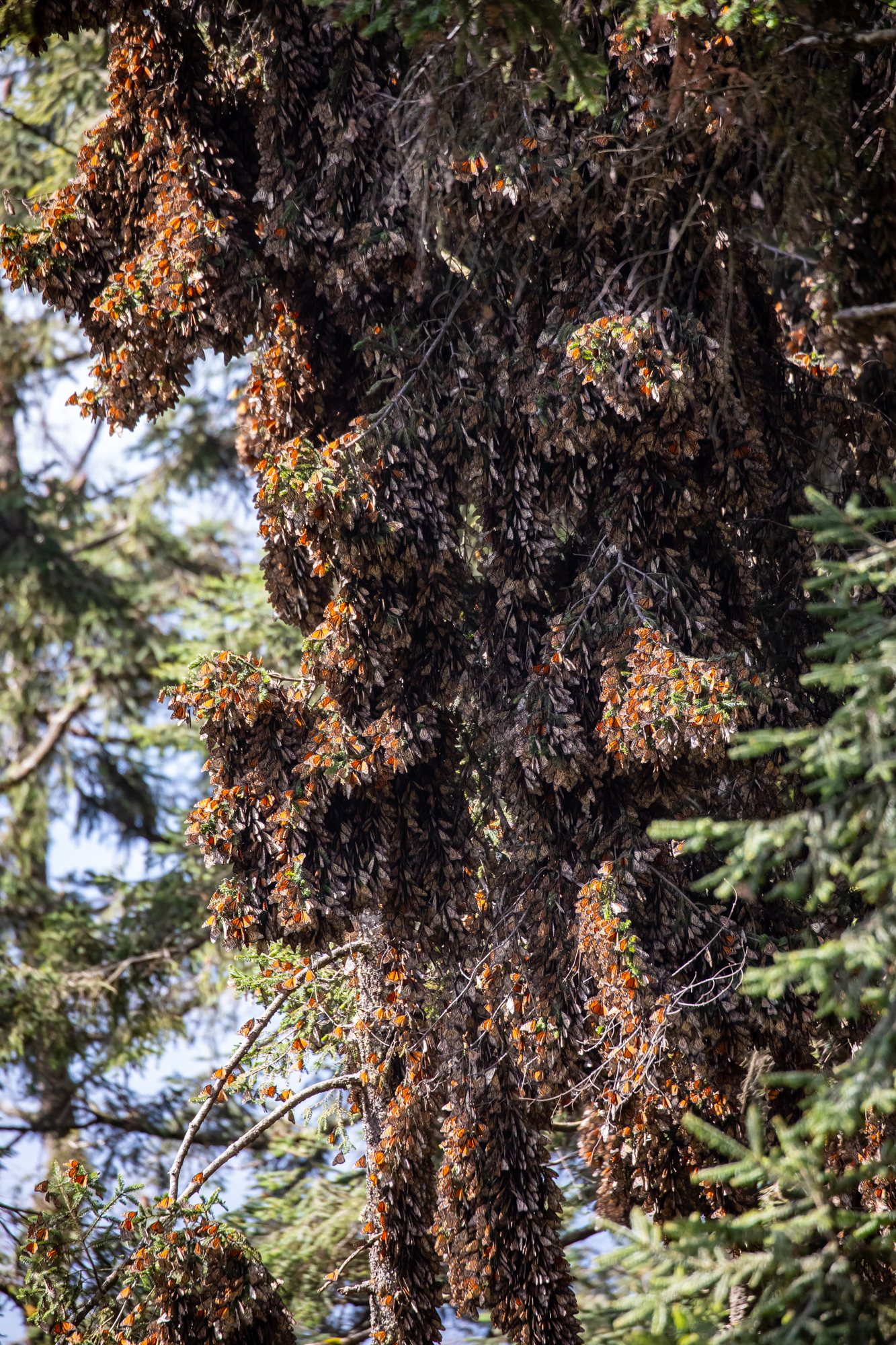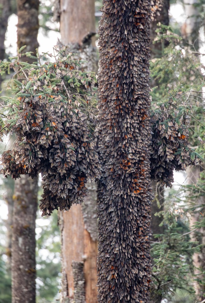 The overwintering generation of monarchs is special. Most adults live only about one month, but the generation that migrates to Mexico lives up to nine months! Shortening day length in the north triggers physiological changes (typically including a halt in reproduction called diapause) as well as the drive to migrate south. Solar cues, and perhaps a sensitivity to the magnetic field of the Earth, steer them in the right direction. And somehow, magically, they end up on a few mountaintops above 10,000 feet in Mexico. By the millions. That’s right, millions.