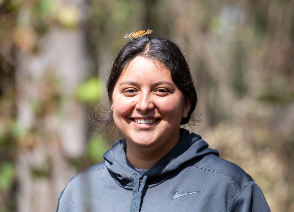 Though there were a number of people at the site to see the butterflies, everyone was silent nearly the entire time. We heard (and made) whispers here and there… guides quietly explaining the amazing migratory phenonmenon, breaths containing exclamations of joy at the sight. There was also a lot of non-verbal communication going on: pointing to ensure others noticed something special, eye contact filled with meaning (and tears) as we shared the awe of the experience. A poignant moment for me was when I looked across at another group and saw a young Mexican woman with a monarch on her head. I pointed at my camera, silently asking if I could take her picture. She nodded and grinned.