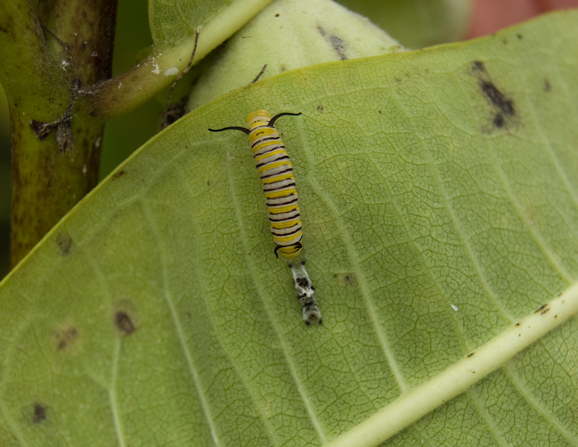 At the very start of my career, when I knew next to nothing about the natural world, I got involved in monitoring monarch caterpillars at the site that would one day become Prairie Ridge (through Mike, of course). During the peak of caterpillar season (aka the late summer and early fall), we’d go out to a milkweed patch once a week and look at every milkweed leaf along a transect for monarch eggs and caterpillars, identifying the caterpillars to their particular stage of development (first through fifth instars, or molts). In the fall, we’d also take every opportunity we could to catch and tag monarch butterflies with uniquely-numbered stickers from Monarch Watch at the University of Kansas, a program tracking the migration of the adult butterflies.