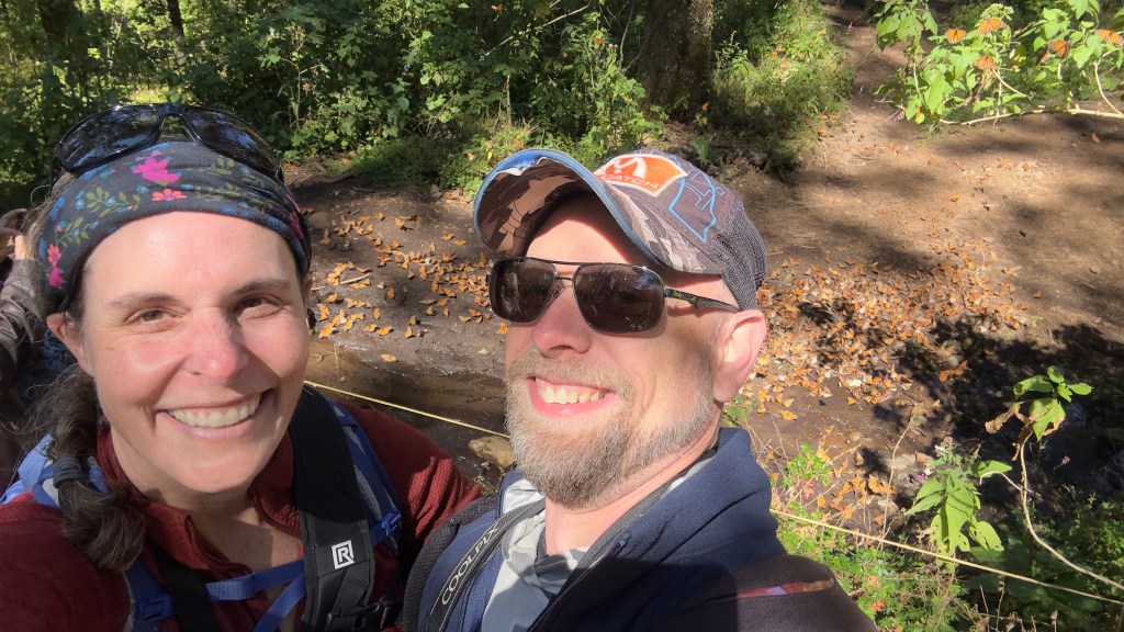 When we arrived at the area where the butterflies had clustered the previous night, the numbers flying over and around us crescendoed. In looking through my pictures and videos, though I took hundreds, so few of them really do justice to the spectacle we witnessed. Like at Chincua, there were branches of the oyamel fir trees just dripping with butterflies. And everywhere you looked there were butterflies in flight, some taking off from clusters, some returning. As the day continued to warm, there were more and more — low, high, among the branches, or landing on people and flowers and shrubs and the ground.