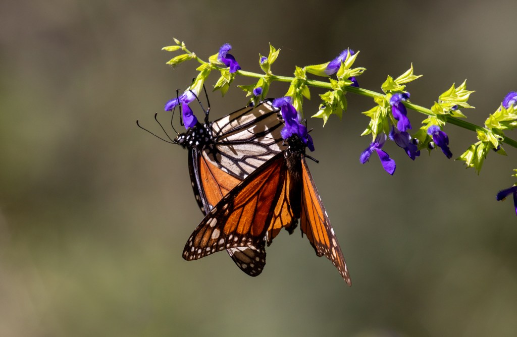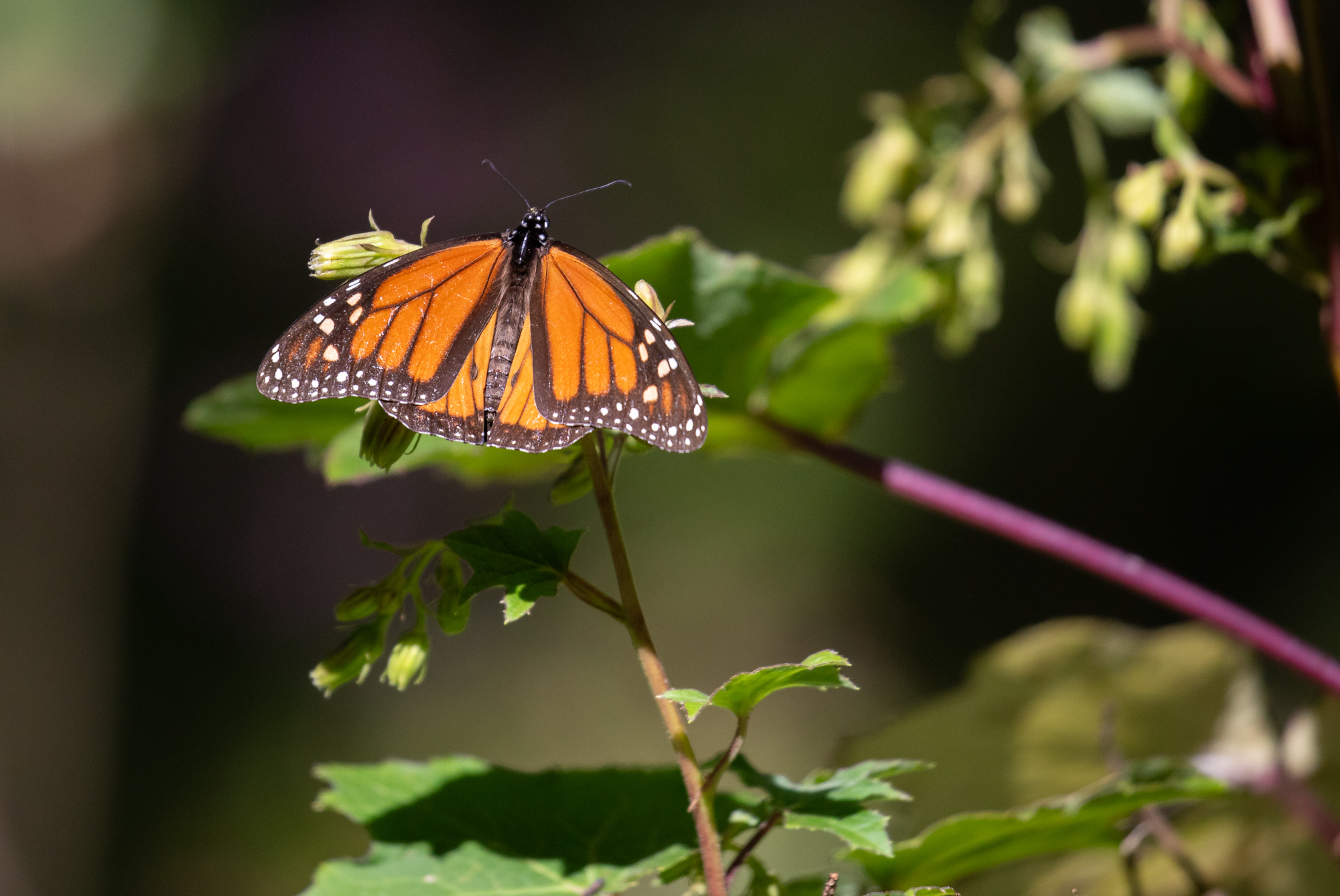 As we approached the parking area for the reserve, the sky was blue and cloudless, a good sign for more flying monarchs than we’d seen the day before at Sierra Chincua. We quickly moved past the numerous stalls selling all sorts of butterfly-themed souvenirs, climbed a short set of steps, and hopped onto the horses that would take up closer to the roosting area. The trail was steep, and a few of the horses had quite a bounce in their step. This wasn’t to the liking of all the riders in our group, but I loved the ride and enjoyed checking out more wildflowers that reminded me of home on the trailsides. Again, the final climb was on foot and at high elevation. As we approached the roosting area, we started seeing monarchs flying here and there under the blue sky, some hanging on flowers to nectar, a few landing at the edge of a small stream to drink and gather minerals.