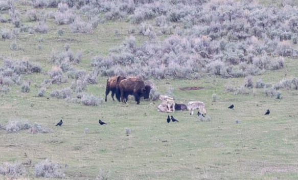 The bison pair came back to investigate while the wolves fed, stopping only a few feet away before turning and walking off. Note the gathering of ravens waiting their turn at the carcass.