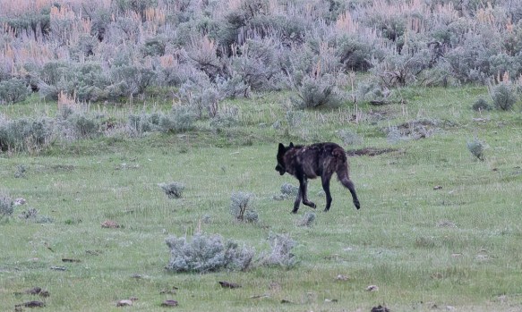 Our trip yesterday started with some bison and then this black wolf trotting briskly a hundred yards or so off the road.