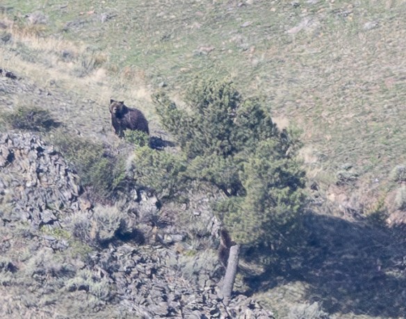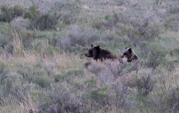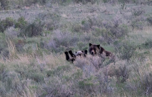 The sow and one cub look up for their sage bed. They were only about 100 yards off the road but the fading light made it almost impossible to get a sharp photo.