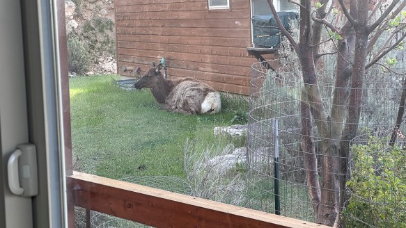 We don’t need to go far to see wildlife…this cow elk has been spending time right outside one of our living room windows along with an occasional mule deer (click photos to enlarge)