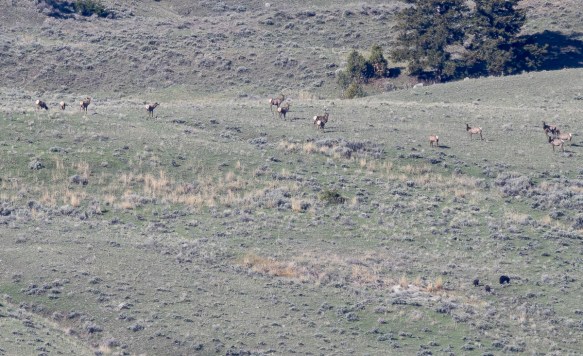 A scene from our main living room windows – a herd of elk keeping a wary eye on a grizzly family. We can scan the hillsides near the park entrance from our house and one morning last week I spotted a grizzly sow with two cubs from last year digging for food.