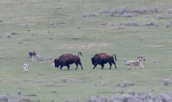 The Mollie’s typically spend their time in Pelican Valley, where they learned to hunt the primary prey available in the harsh winters there – bison. They have made occasional forays into Lamar Valley over the years, but locals think they now may have a den somewhere near Lamar Valley. They are noticeably large wolves and are known to be efficient hunters. We saw six of the Mollie’s walking on the far side of the river and suddenly start trotting towards a pair of bison. One wolf strayed from the group and five moved in and surrounded the behemoths.The bison responded with tails up and turned to face the wolves. The encounter lasted several minutes with most of the wolves soon realizing these two healthy bison would not be an easy target. The wolves finaly moved off and found their wandering pack mate who had discovered an apparently lifeless bison calf. The group quickly moved in and started feeding while we watched through a spotting scope.