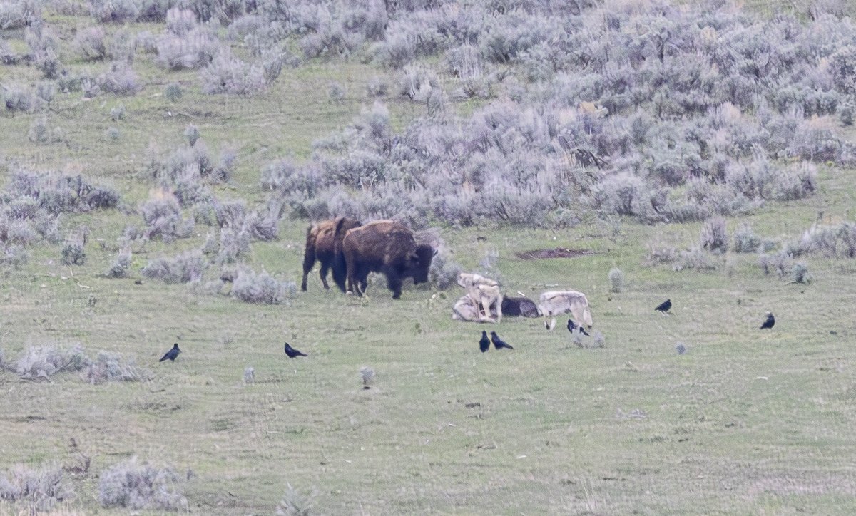 The bison pair came back to investigate while the wolves fed, stopping only a few feet away before turning and walking off. Note the gathering of ravens waiting their turn at the carcass.