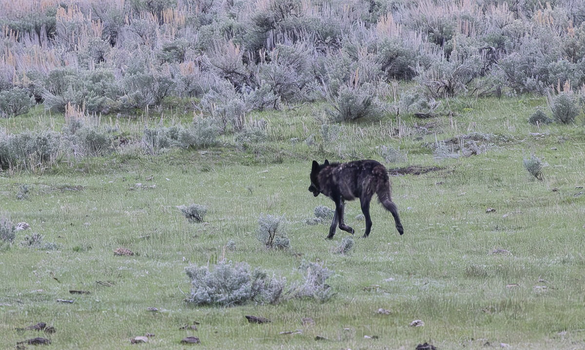 Our trip yesterday started with some bison and then this black wolf trotting briskly a hundred yards or so off the road.