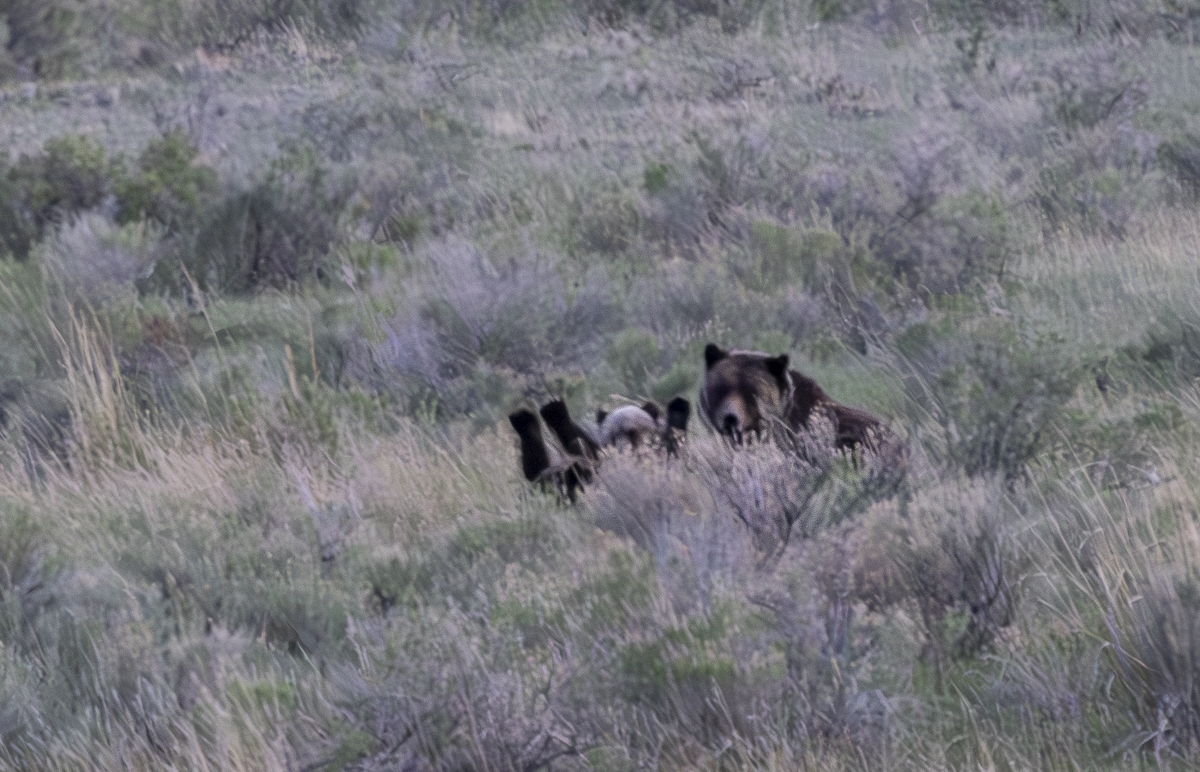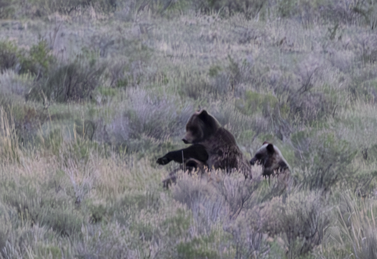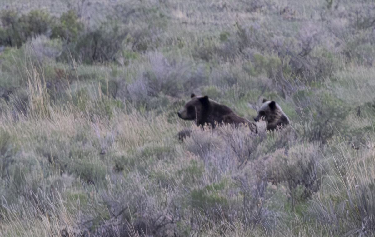 The sow and one cub look up for their sage bed. They were only about 100 yards off the road but the fading light made it almost impossible to get a sharp photo.