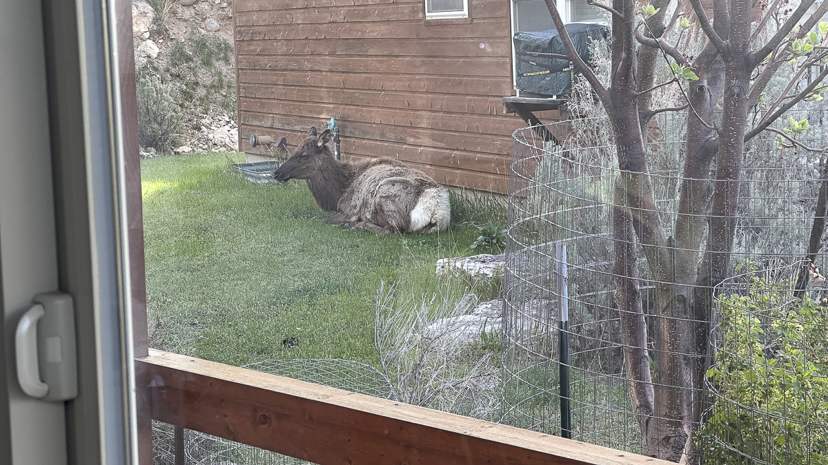 We don’t need to go far to see wildlife…this cow elk has been spending time right outside one of our living room windows along with an occasional mule deer (click photos to enlarge)