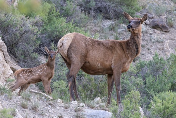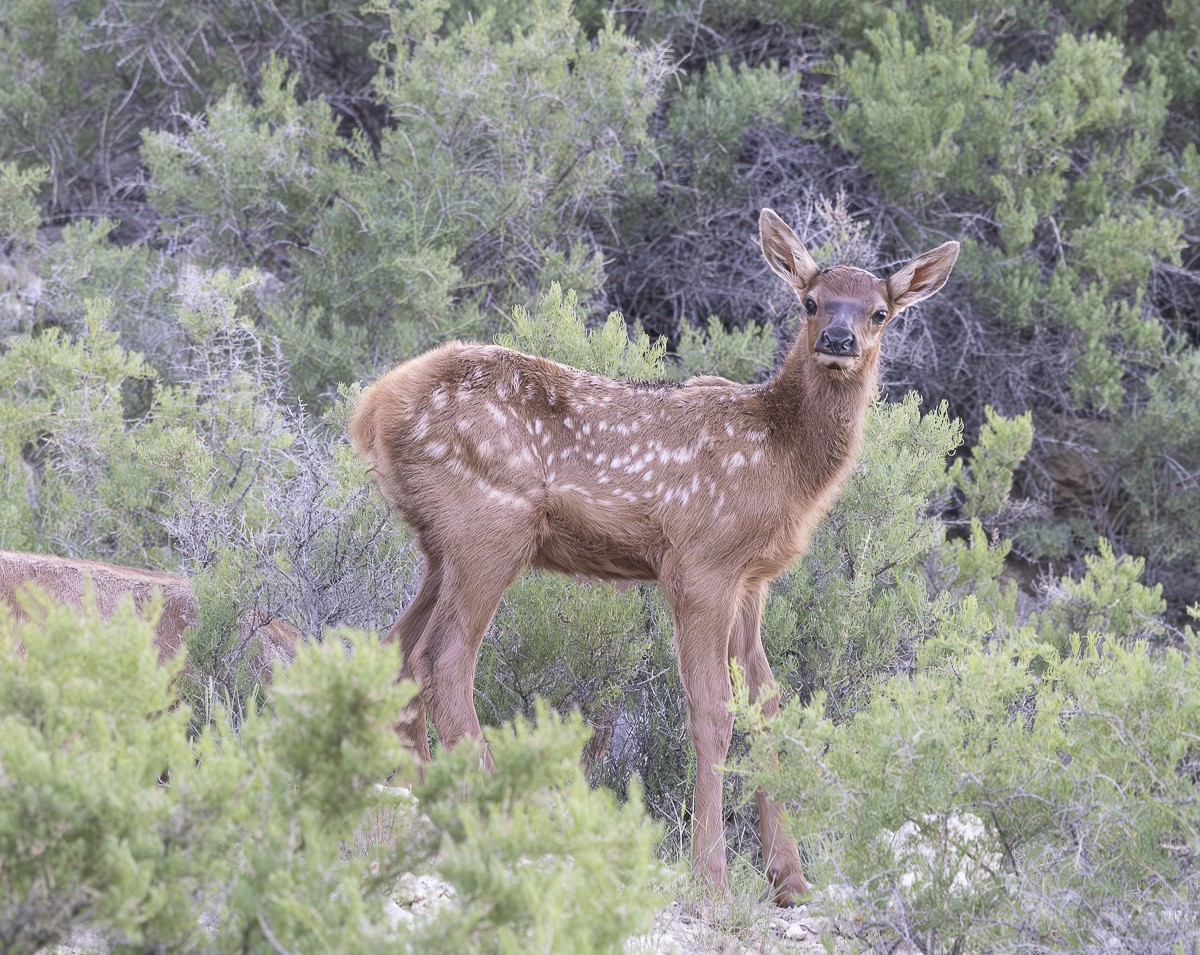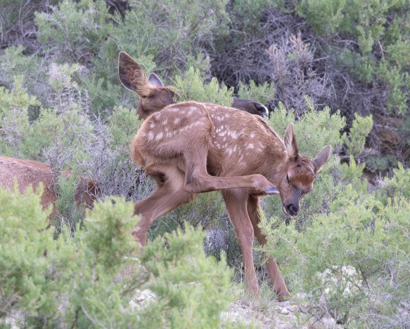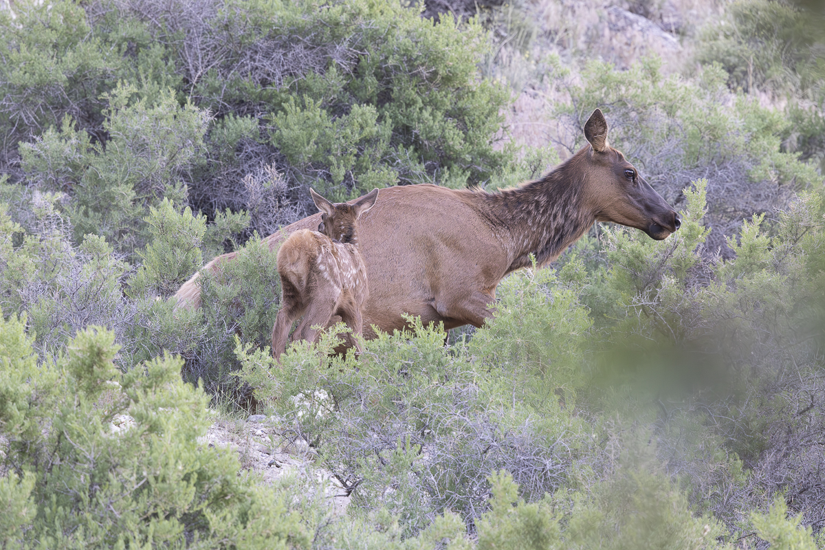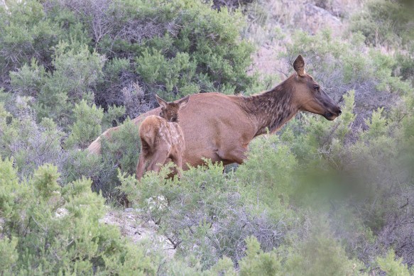 You dare not get close to an elk calf as the mothers are very protective. Just last week we had hiked up that same path to the base of that cliff and put out two trail cameras. I think those will now remain unchecked for a couple more weeks. Mother elk stash their young in bushy areas or other hiding places where the calves remain until she comes back to nurse them. And you don’t want to be the thing that disturbs the calf if the cow is anywhere nearby.