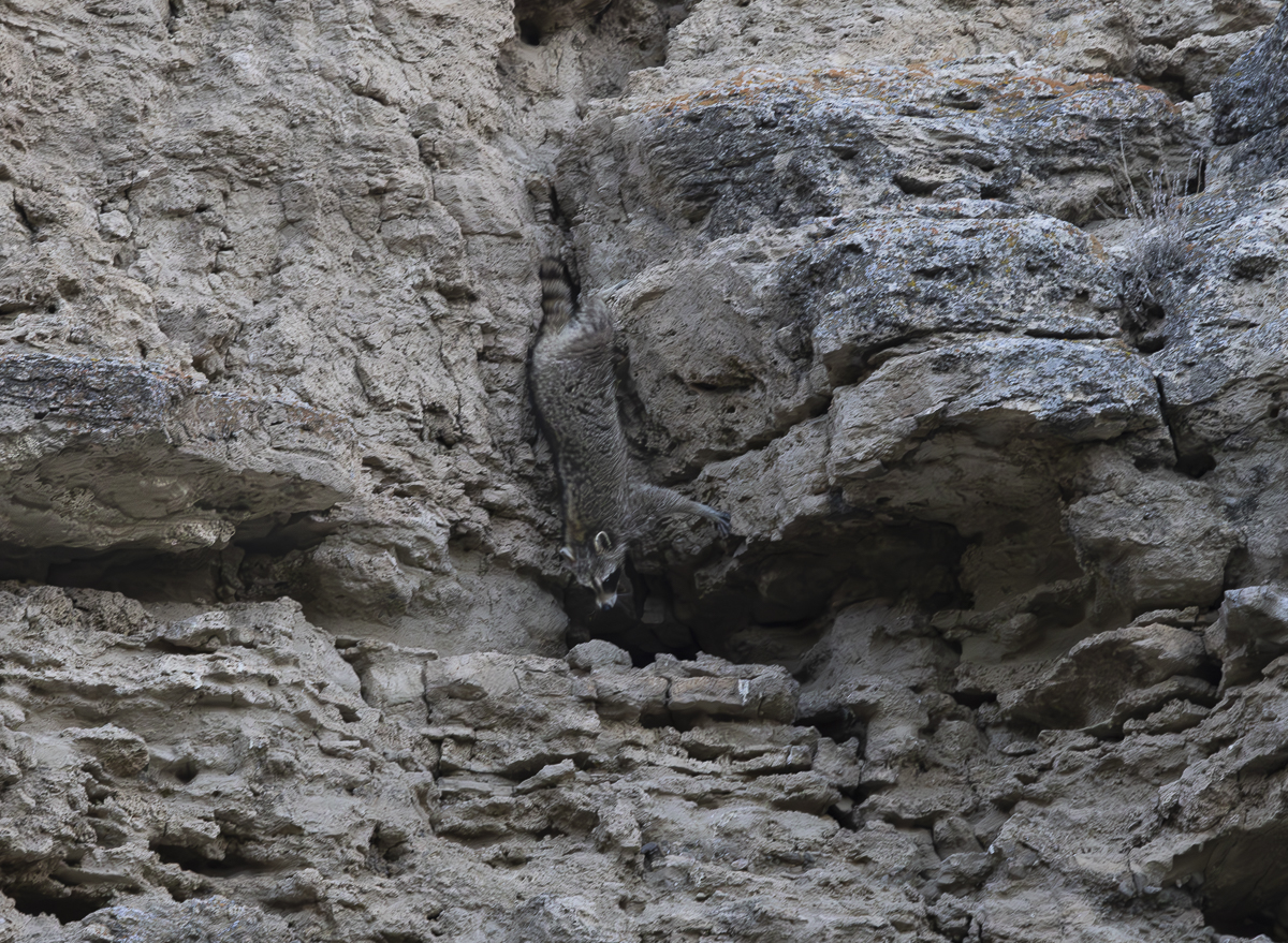 I went out on the deck, camera in hand and could only see one raccoon who quickly spotted me and started moving along the ledge. It then did an impressive scramble down the steep face and disappeared into a crevice in the cliff.