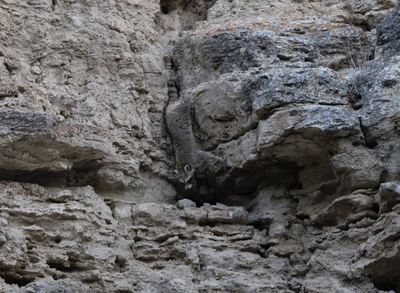 I was awakened this morning about 5:30 a.m. by an elk call that sounded close to the house. I said something and that woke up Melissa who looked out and spotted an alert elk at the base of the cliff behind our house. I walked into the bathroom and saw a gathering of black-billed magpies which is often a sign of a carcass. As I watched, magpies continued to fly in and perch at the top of the cliff. Melissa then spotted two mammals crawling along a ledge on the cliff face – raccoons! I have never seen a raccoon in the park but I had heard they are in town. Having seen many raccoons back east in the woods and along roadsides, it was indeed odd seeing them on the face of a cliff.