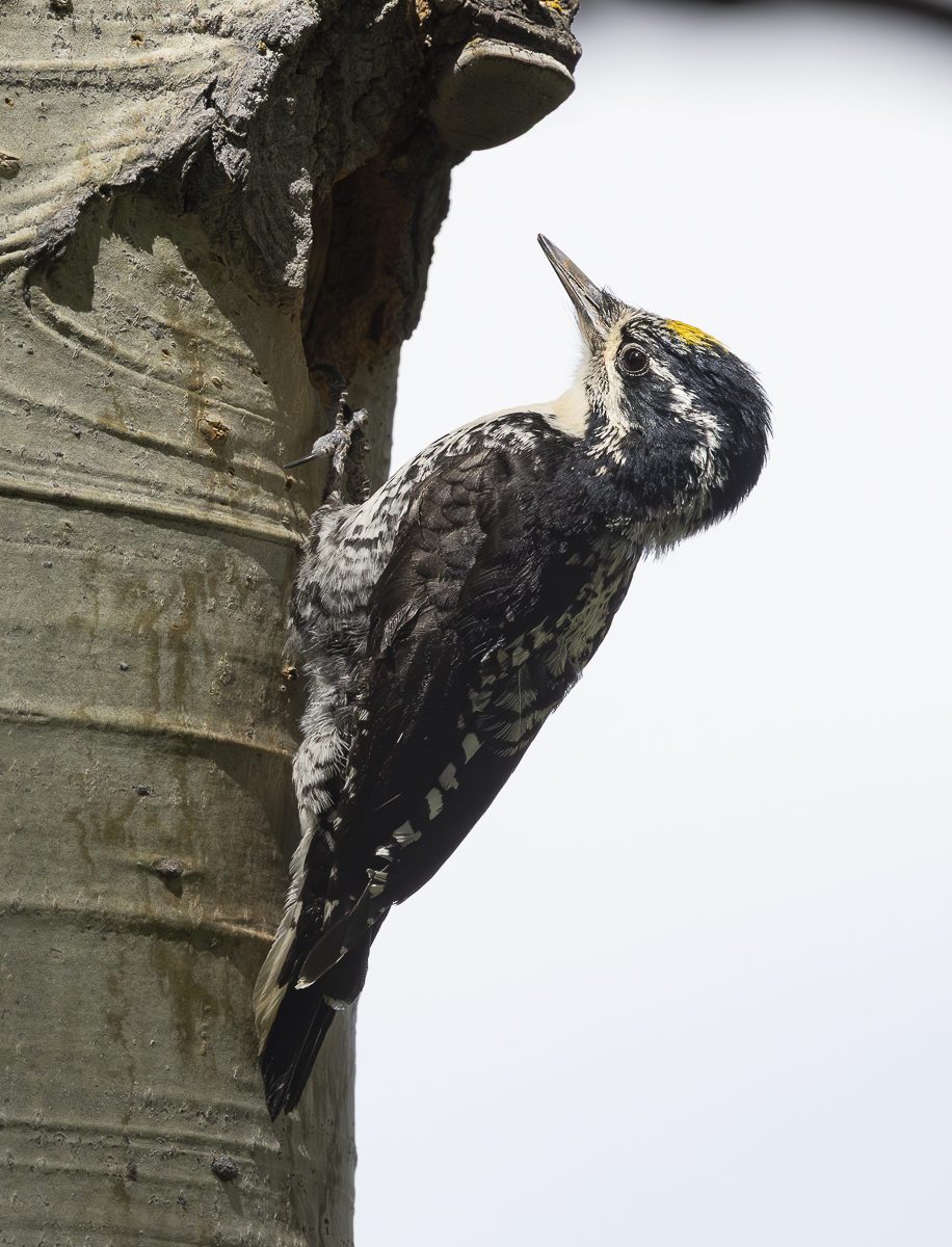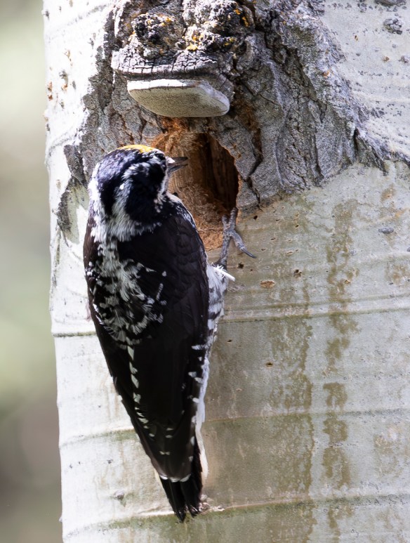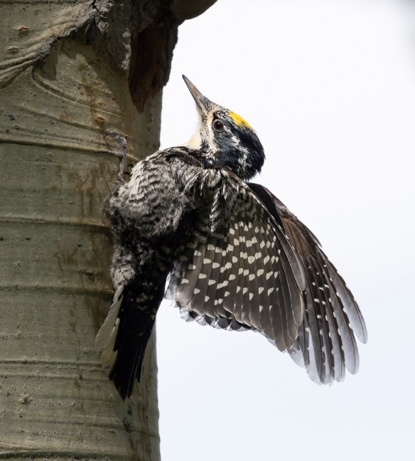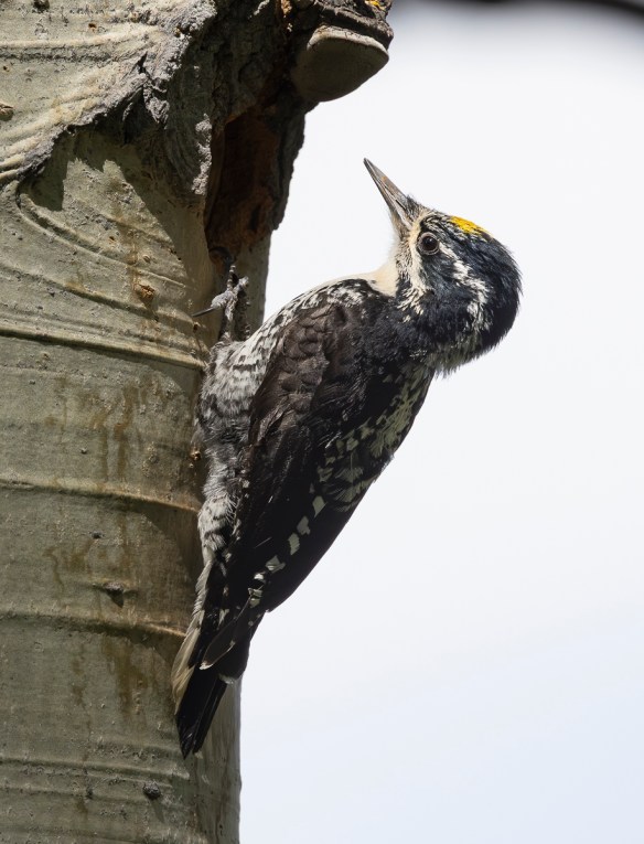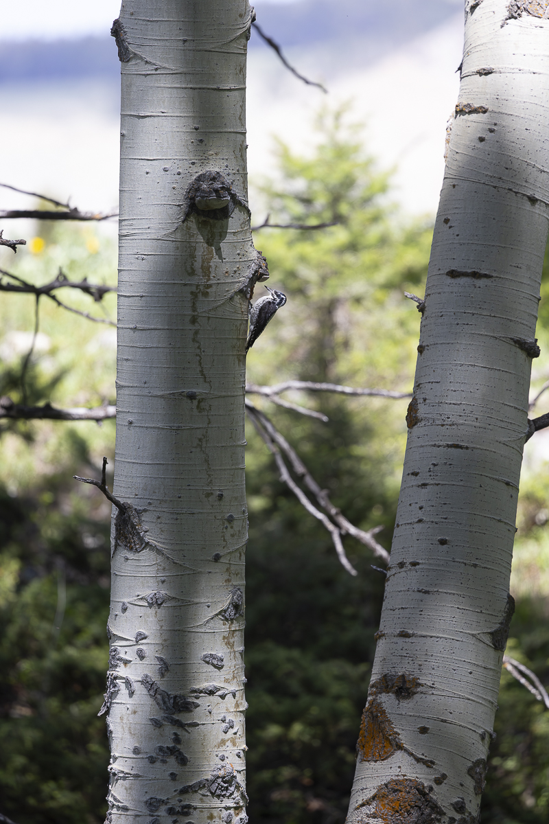 Two days later we decided to do a short hike and go back to the aspen grove via a shorter section of trail that came off the loop we had hiked earlier. We walked in and sat down amongst the towering white trunks and embraced the silence broken only occasionally by the wind rustling the leaves and the sounds of insects and birds. We heard house wrens, ruby-crowned kinglets, and a pair of Cooper’s hawks. I started hearing some faint tapping so i looked around for a woodpecker at the edge of the grove since it sounded somewhat distant. I saw no movement but kept hearing the occasional tapping. At one point we spotted a woodpecker on the side of a trunk and it seemed to disappear.