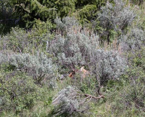 These birds are very tolerant of humans so I eased a bit closer to get a better view and just watched as she pecked at grass seeds and other bits of vegetation. Meanwhile, Melissa excitedly whispered that she had spotted our first elk calf of the season (this was the day before the one we saw behind our house from the last post). I looked and was once again amazed at her spotting ability. The calf had been hidden by her mamma in a tangle of shrubs while she went off to feed (elk calves stay hidden until their mother returns). But this little guy flicked its ears a couple of times and that gave its position away to eagle-eyed Melissa.