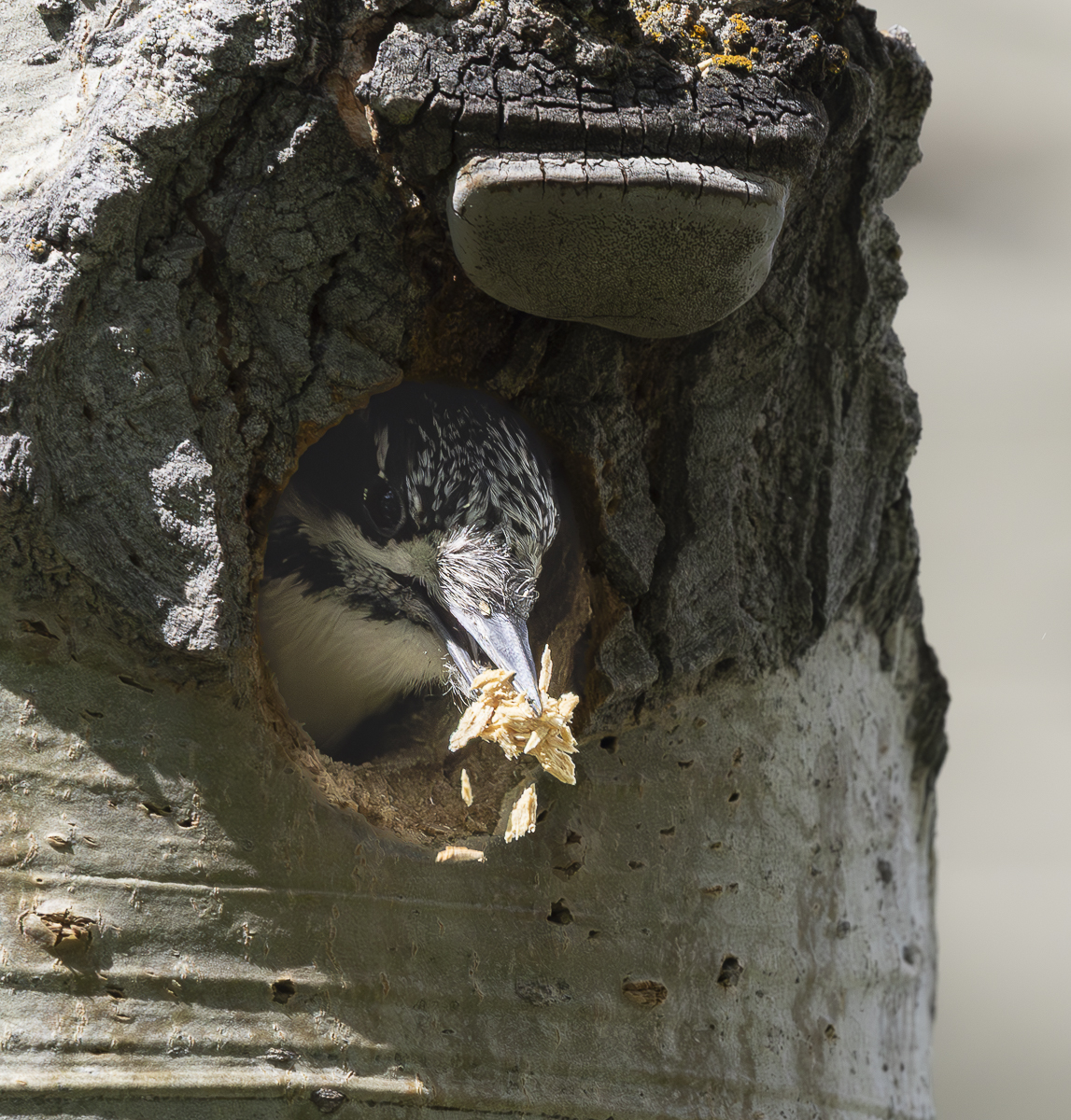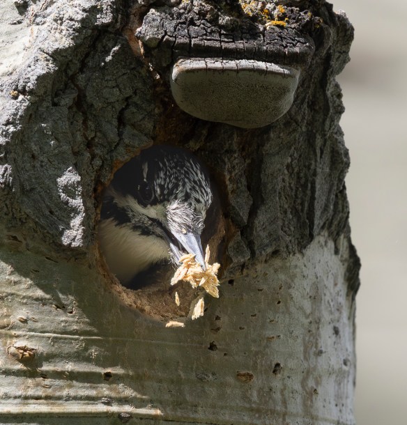–The male American three-toed woodpecker throwing wood chips out of their nest cavity