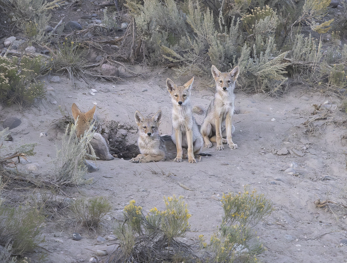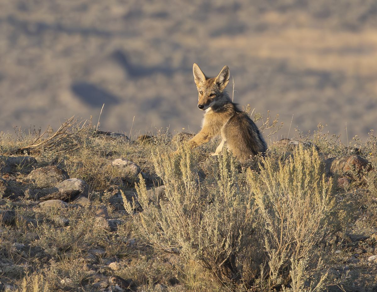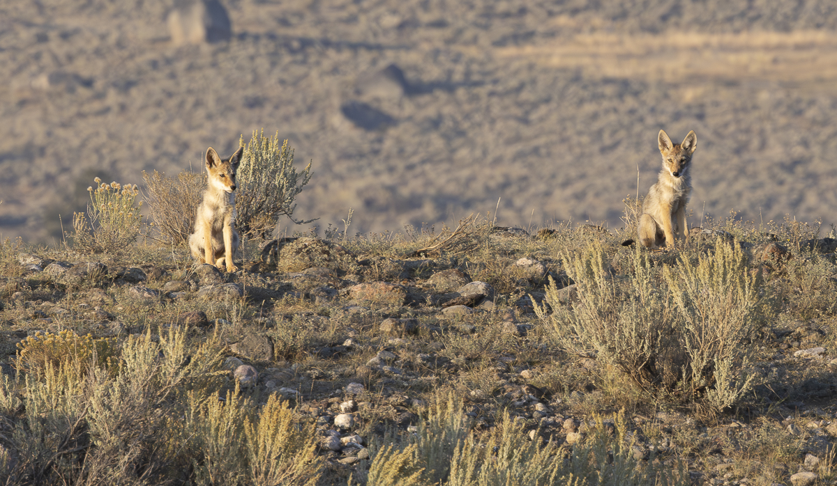 One afternoon back in early September I decided to take a short hike in a spot we have walked may times over the years. I like this walk in the late day sun as I often see various birds in the shrubs along the creek. As I crossed through a gap in the willows on a well-worn path used by bison for perhaps decades, a movement caught my eye on a far hillside. Coyotes! Perhaps three individuals made their way quickly down slope through the sagebrush and stopped at a mound of dirt. I dropped to my knees and soon realized I was looking at a den site and the pups had run down to it when they saw me. I could see two pups sitting at the den entrance. They looked my way for a minute or so and then, to my surprise, two of them went back up to the top of the hill.