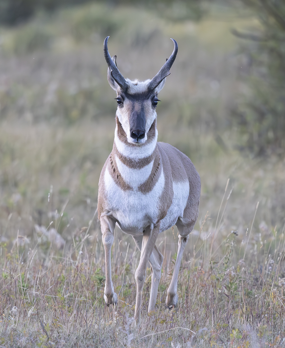 On my walk out, a pronghorn buck came over a small ridge along my path. I stopped and it continued walking beyond me and started to cross through the line of willows along the creek. It hesitated, came back out and tried another spot. It didn’t seem to like that one either (they both were muddy with deep prints from bison crossings). To my surprise, it came out and trotted straight toward me before realizing that I was still there. He veered off and walked at a brisk pace around and behind me and crossed the willows in the dry gap I had taken earlier.