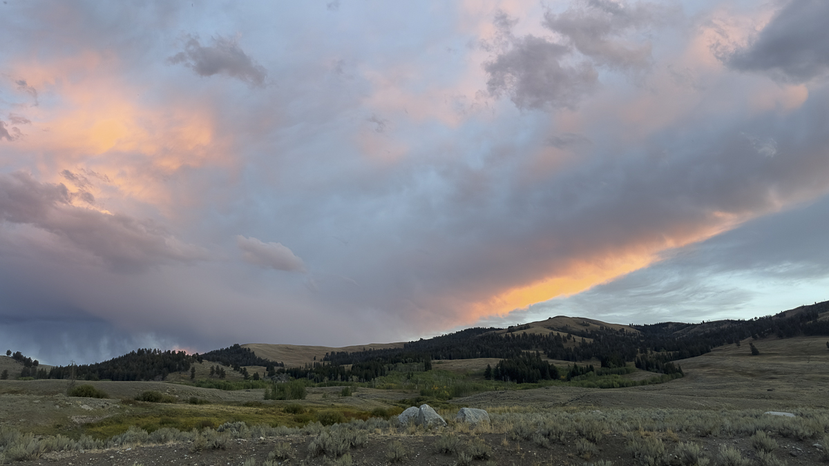 I went back a few times by myself after Melissa started attending a week-long online nature journaling conference. I took her scope and phone adapter and got several minutes of video (I have since bought an adapter for my scope). As I approached the site I would stop at one point far away and scan the area with binoculars and at least one pup was always visible laying on top of the ridge. I didn’t want to disturb them if adults were present or if the pups seemed afraid (I never did see an adult at the site). I also tried to not attract any attention from other people in the pullouts as I certainly didn’t want a crowd going up to that area. After the second trip out to see the den, it seemed the pups just looked at me as another part of the landscape. They stopped going down to the den entrance and just remained on the ridge. They watched me until I sat down and then they resumed what they were doing, which was mainly laying down looking north, presumably waiting on their parents to return with food. I have a lot of video clips with Melissa’s scope of pups sleeping with an occasional ear wiggle or brief look around. I usually stayed about an hour and left at sunset (many of which were gorgeous). The pups would glance my way and then lay back down as I left.