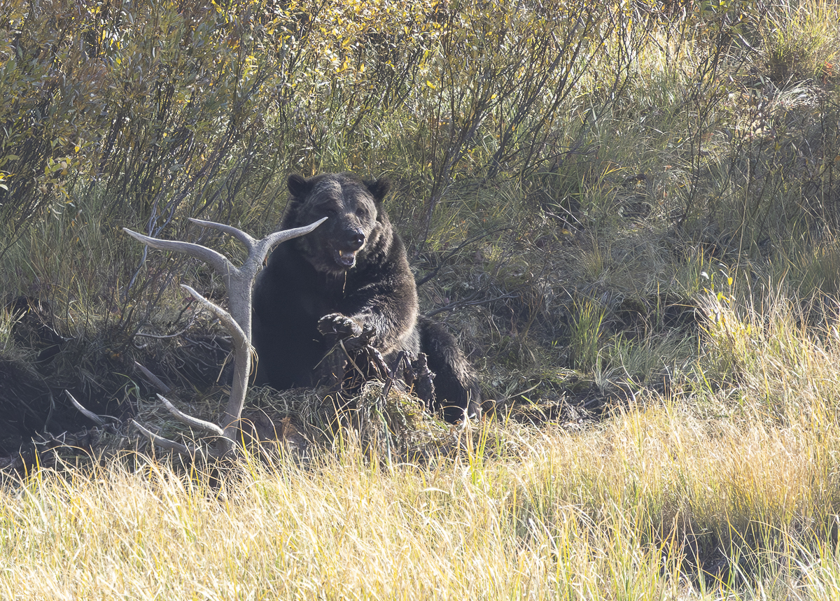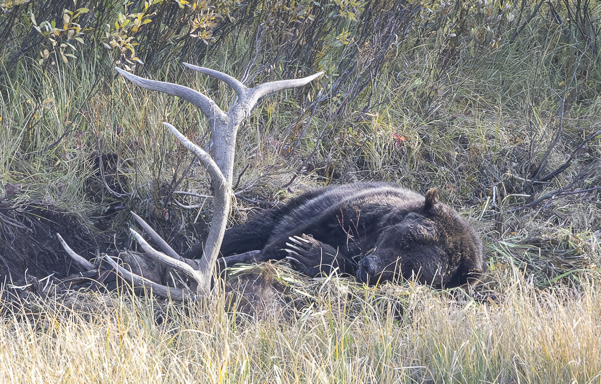 –The big grizzly lays down on the elk carcass – note the bear’s huge claws!