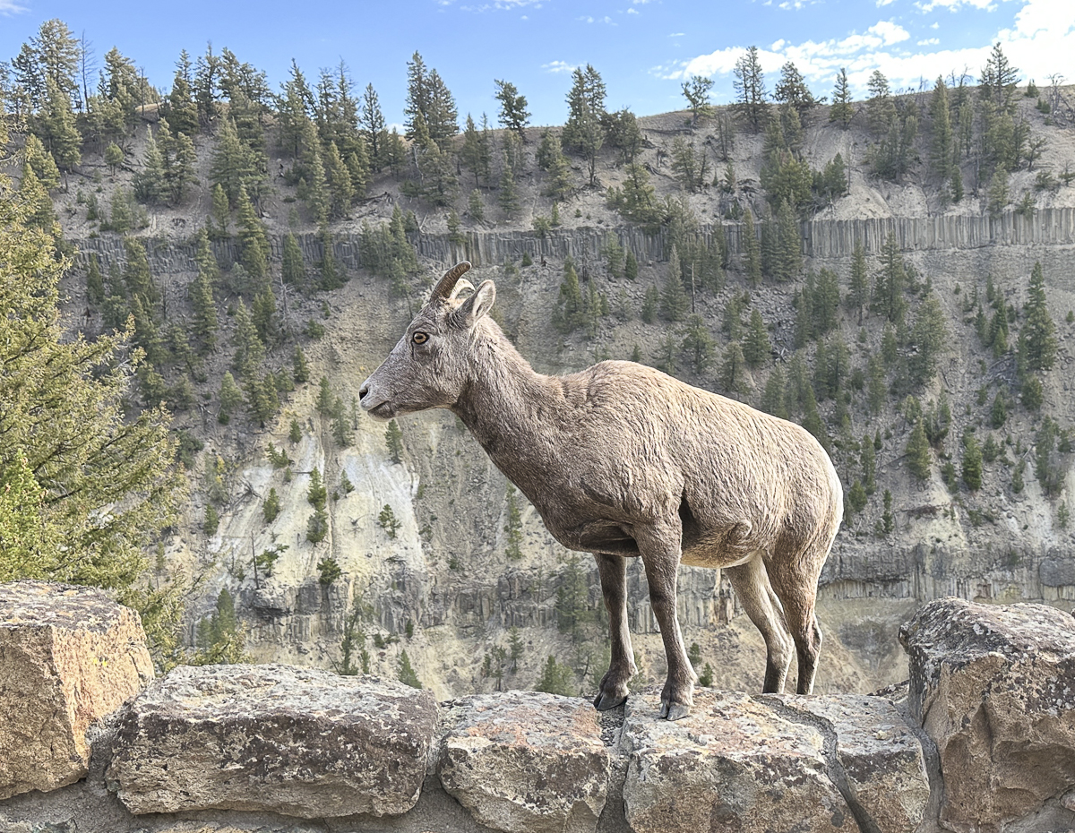 Driving through the lower part of the Grand Canyon of the Yellowstone I was surprised to see two (only one is shown here) bighorn sheep ewes perched atop the stone barrier along the road. I slowed down and snapped one phone pic as I drove past. It is not often you see them so close.