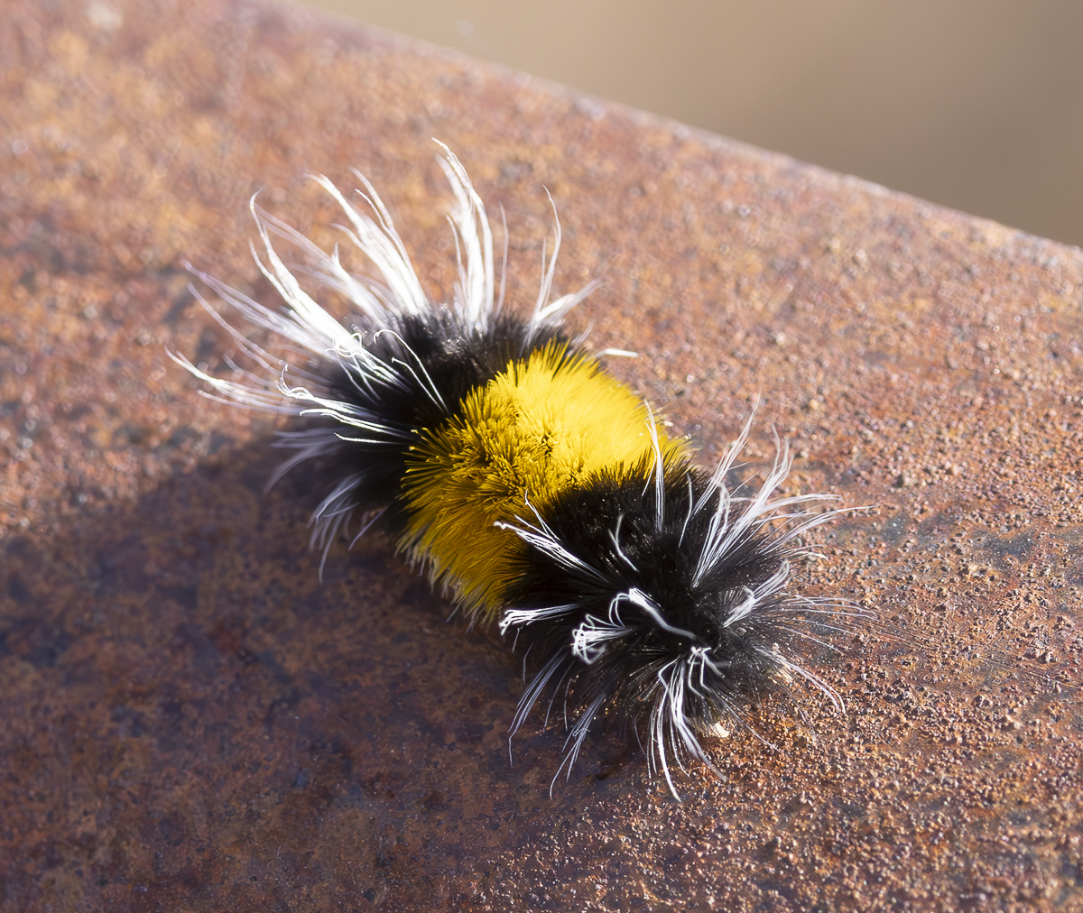 The spotted tussock moth caterpillar is actually a type of tiger moth larva. It feeds on a variety of deciduous shrub and tree leaves and reminds me a bit of a flamboyant woolly bear with a spiked hairdo.